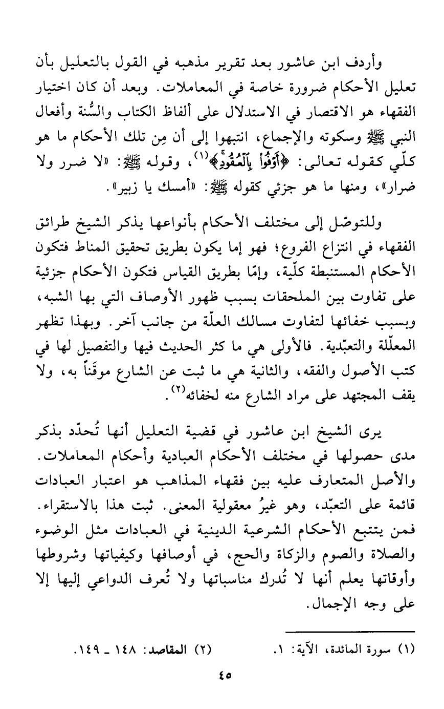 وأردف ابن عاشور بعد تقرير مذهبه في القول بالتعليل بأن تعليل الأحكام ضرورة خاصة في المعاملات. وبعد أن كان اختيار الفقهاء هو الاقتصار في الاستدلال على ألفاظ الكتاب والسُّنة وأفعال النبي - صلى الله عليه وسلم - وسكوته والإجماع، انتبهوا إلى أن مِن تلك الأحكام ما هو كلّي كقوله تعالى: {أَوْفُوا بِالْعُقُودِ} (¬1)، وقوله - صلى الله عليه وسلم -: "لا ضرر ولا ضرار"، ومنها ما هو جزئي كقوله - صلى الله عليه وسلم -: "أمسك يا زبير".