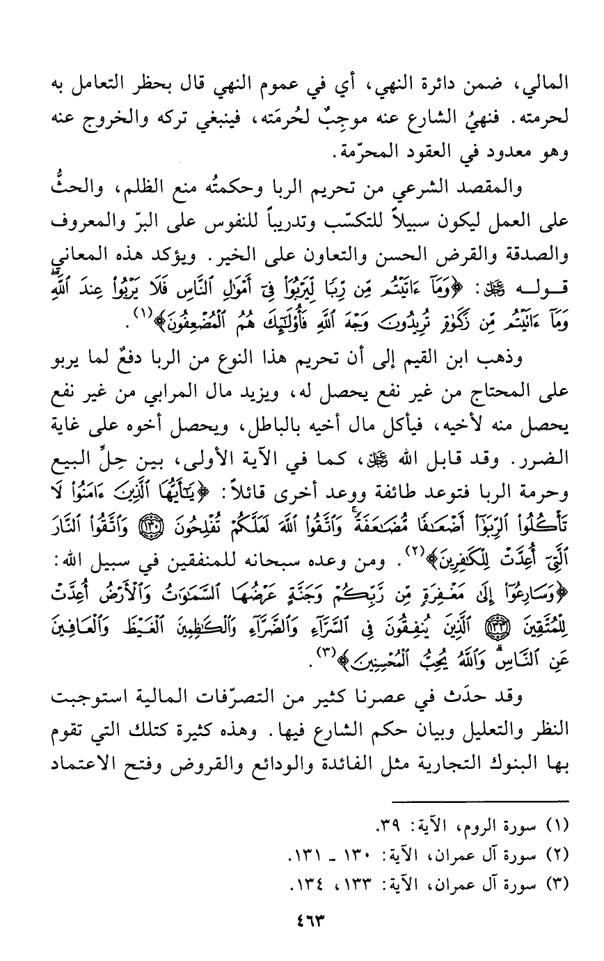 وذهب ابن القيم إلى أن تحريم هذا النوع من الربا دفعٌ لما يربو على المحتاج من غير نفع يحصل له، ويزيد مال المرابي من غير نفع يحصل منه لأخيه، فيأكل مال أخيه بالباطل، ويحصل أخوه على غاية الضرر. وقد قابل الله - عز وجل -، كما في الآية الأولى، بين حِلِّ البيع وحرمة الربا فتوعد طائفة ووعد أخرى قائلاً: {يَا أَيُّهَا الَّذِينَ آمَنُوا لَا تَأْكُلُوا الرِّبَا أَضْعَافًا مُضَاعَفَةً وَاتَّقُوا اللَّهَ لَعَلَّكُمْ تُفْلِحُونَ (130) وَاتَّقُوا النَّارَ الَّتِي أُعِدَّتْ لِلْكَافِرِينَ} (¬2). ومن وعده سبحانه للمنفقين في سبيل الله: {وَسَارِعُوا إِلَى مَغْفِرَةٍ مِنْ رَبِّكُمْ وَجَنَّةٍ عَرْضُهَا السَّمَاوَاتُ وَالْأَرْضُ أُعِدَّتْ لِلْمُتَّقِينَ (133) الَّذِينَ يُنْفِقُونَ فِي السَّرَّاءِ وَالضَّرَّاءِ وَالْكَاظِمِينَ الْغَيْظَ وَالْعَافِينَ عَنِ النَّاسِ وَاللَّهُ يُحِبُّ الْمُحْسِنِينَ} (¬3).