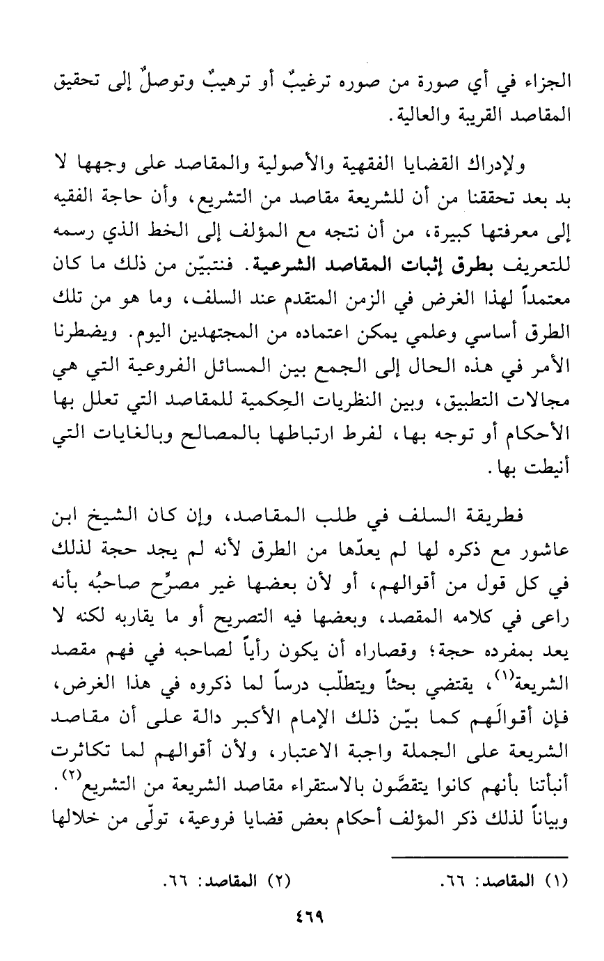 ولإدراك القضايا الفقهية والأصولية والمقاصد على وجهها لا بد بعد تحققنا من أن للشريعة مقاصد من التشريع، وأن حاجة الفقيه إلى معرفتها كبيرة، من أن نتجه مع المؤلف إلى الخط الذي رسمه للتعريف بطرق إثبات المقاصد الشرعية. فنتبيّن من ذلك ما كان معتمداً لهذا الغرض في الزمن المتقدم عند السلف، وما هو من تلك الطرق أساسي وعلمي يمكن اعتماده من المجتهدين اليوم. ويضطرنا الأمر في هذه الحال إلى الجمع بين المسائل الفروعية التي هي مجالات التطبيق، وبين النظريات الحِكمية للمقاصد التي تعلل بها الأحكام أو توجه بها، لفرط ارتباطها بالمصالح وبالغايات التي أنيطت بها.