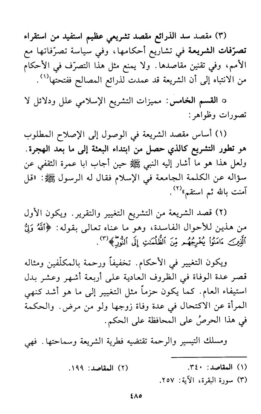 (2) قصد الشريعة من التشريع التغيير والتقرير. ويكون الأول من هذين للأحوال الفاسدة، وهو ما عناه تعالى بقوله: {اللَّهُ وَلِيُّ الَّذِينَ آمَنُوا يُخْرِجُهُمْ مِنَ الظُّلُمَاتِ إِلَى النُّورِ} (¬3).