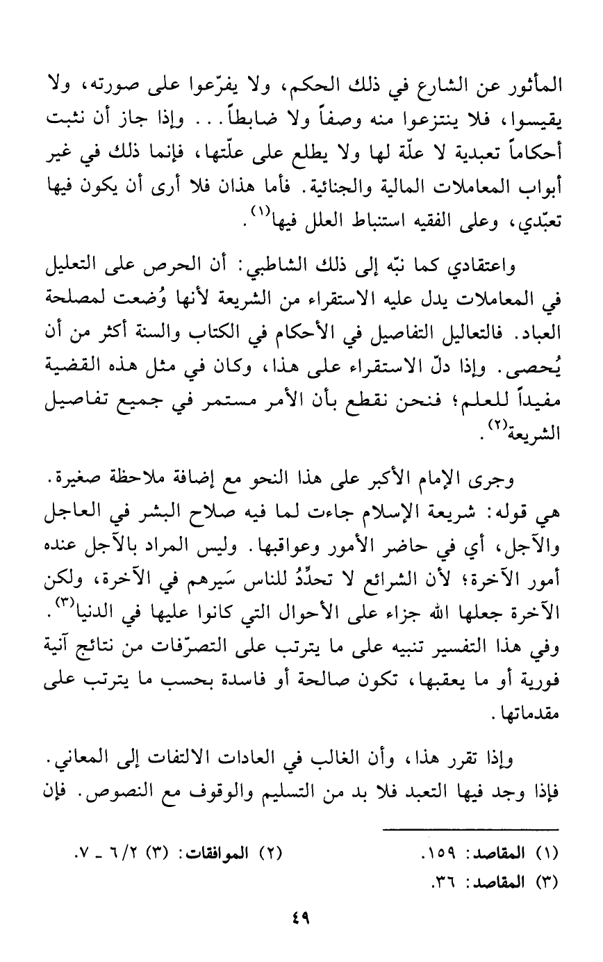 واعتقادي كما نبّه إلى ذلك الشاطبي: أن الحرص على التعليل في المعاملات يدل عليه الاستقراء من الشريعة لأنها وُضعت لمصلحة العباد. فالتعاليل التفاصيل في الأحكام في الكتاب والسنة أكثر من أن يُحصى. وإذا دلّ الاستقراء على هذا، وكان في مثل هذه القضية مفيداً للعلم؛ فنحن نقطع بأن الأمر مستمر في جميع تفاصيل الشريعة (¬2).