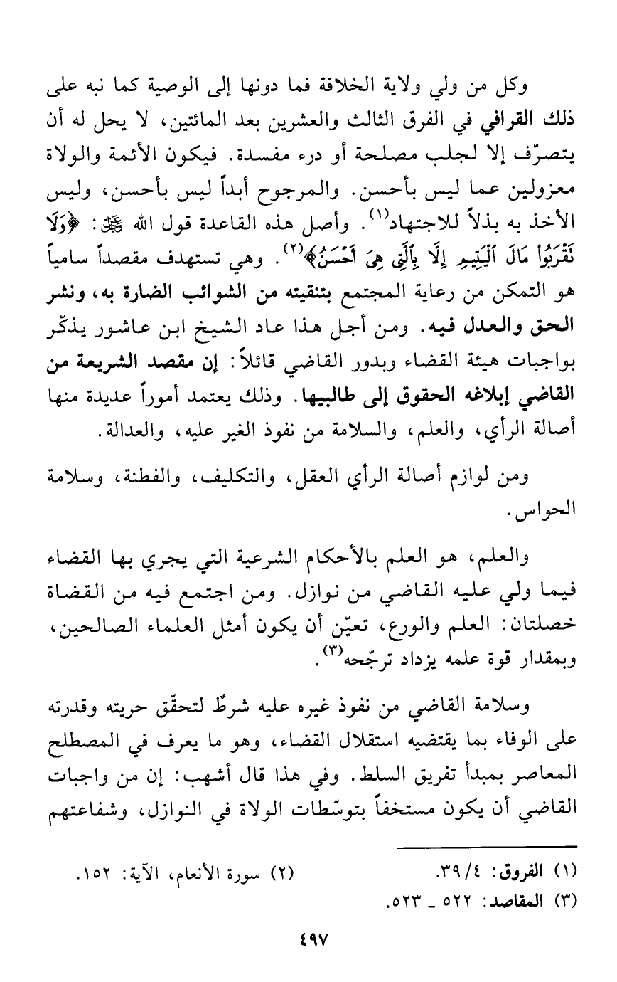 وكل من ولي ولاية الخلافة فما دونها إلى الوصية كما نبه على ذلك القرافي في الفرق الثالث والعشرين بعد المائتين، لا يحل له أن يتصرّف إلا لجلب مصلحة أو درء مفسدة. فيكون الأئمة والولاة معزولين عما ليس بأحسن. والمرجوح أبداً ليس بأحسن، وليس الأخذ به بذلاً للاجتهاد (¬1). وأصل هذه القاعدة قول الله - عز وجل -: {وَلَا تَقْرَبُوا مَالَ الْيَتِيمِ إِلَّا بِالَّتِي هِيَ أَحْسَنُ} (¬2). وهي تستهدف مقصداً سامياً هو التمكن من رعاية المجتمع بتنقيته من الشوائب الضارة به، ونشر الحق والعدل فيه. ومن أجل هذا عاد الشيخ ابن عاشور يذكّر بواجبات هيئة القضاء وبدور القاضي قائلاً: إن مقصد الشريعة من القاضي إبلاغه الحقوق إلى طالبيها. وذلك يعتمد أموراً عديدة منها أصالة الرأي، والعلم، والسلامة من نفوذ الغير عليه، والعدالة.