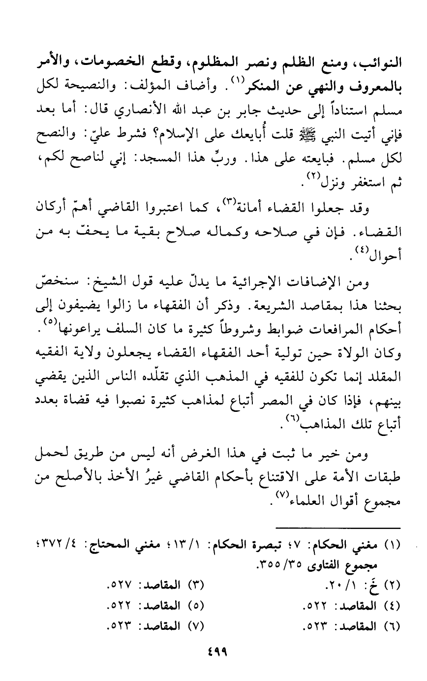 النوائب، ومنع الظلم ونصر المظلوم، وقطع الخصومات، والأمر بالمعروف والنهي عن المنكر (¬1). وأضاف المؤلف: والنصيحة لكل مسلم استناداً إلى حديث جابر بن عبد الله الأنصاري قال: أما بعد فإني أتيت النبي - صلى الله عليه وسلم - قلت أُبايعك على الإسلام؟ فشرط عليّ: والنصح لكل مسلم. فبايعته على هذا. وربَّ هذا المسجد: إني لناصح لكم، ثم استغفر ونزل (¬2).