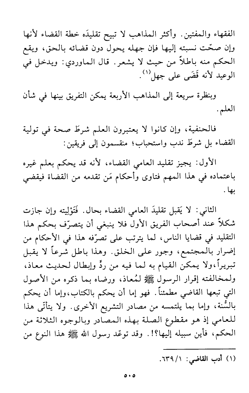 الفقهاء والمفتين. وأكثر المذاهب لا تبيح تقليدَه خطة القضاء لأنها وإن صحّت نسبته إليها فإن جهله يحول دون قضائه بالحق، ويقع الحكم منه باطلاً من حيث لا يشعر. قال الماوردي: ويدخل في الوعيد لأنه قَضَى على جهل (¬1).