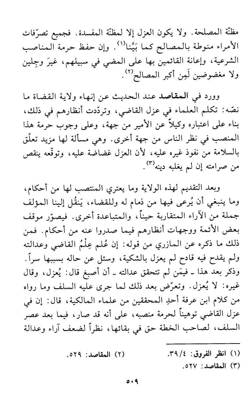 وورد في المقاصد عند الحديث عن إنهاء ولاية القضاة ما نصّه: تكلم العلماء في عزل القاضي، وتردّدت أنظارهم في ذلك، بناء على اعتباره وكيلاً عن الأمير من جهة، وعلى وجوب حرمة هذا المنصب في نظر الناس من جهة أخرى. وهي مسألة لها مزيد تعلّق بالسلامة من نفوذ غيره عليه، لأن العزل غضاضة عليه، وتوقّعه ينقص من صرامته إن لم يغلبه دينه (¬3).
