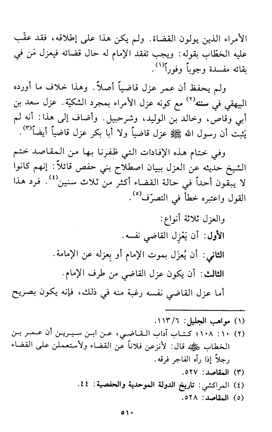 وفي ختام هذه الإفادات التي ظفرنا بها من المقاصد ختم الشيخ حديثه عن العزل ببيان اصطلاح بني حفص قائلاً: إنهم كانوا لا يبقون أحداً في حالة القضاء أكثر من ثلاث سنين (¬4). فرد هذا القول واعتبره خطأ في التصرّف (¬5).