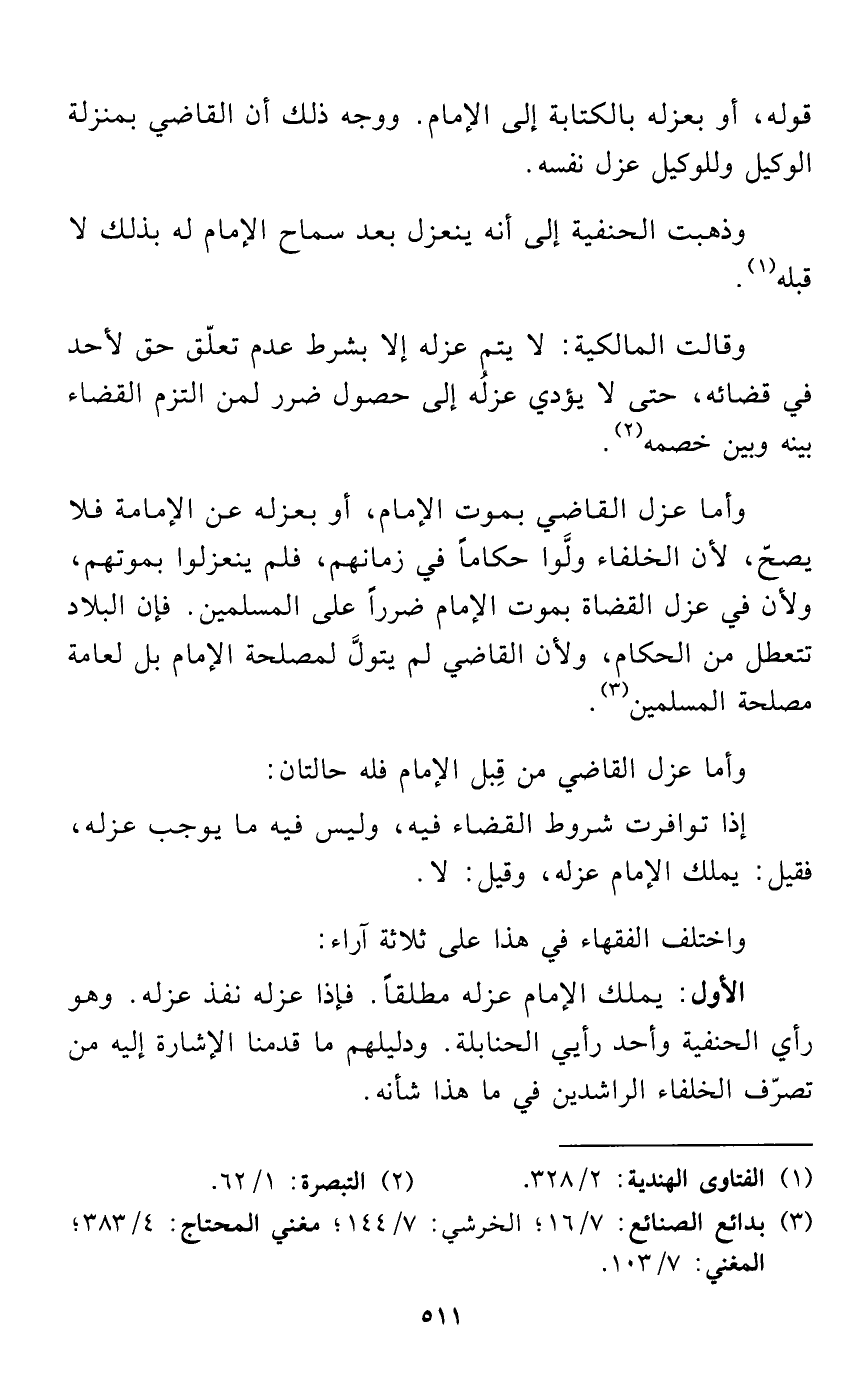 وأما عزل القاضي بموت الإمام، أو بعزله عن الإمامة فلا يصحّ، لأن الخلفاء ولَّوا حكاماً في زمانهم، فلم ينعزلوا بموتهم، ولأن في عزل القضاة بموت الإمام ضرراً على المسلمين. فإن البلاد تتعطل من الحكام، ولأن القاضي لم يتولَّ لمصلحة الإمام بل لعامة مصلحة المسلمين (¬3).