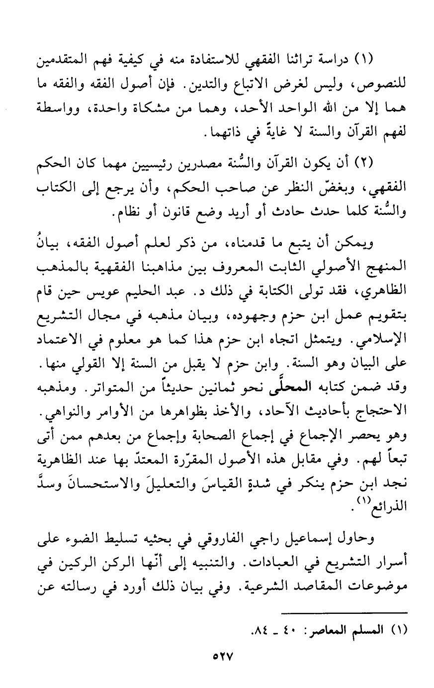 (1) دراسة تراثنا الفقهي للاستفادة منه في كيفية فهم المتقدمين للنصوص، وليس لغرض الاتباع والتدين. فإن أصول الفقه والفقه ما هما إلا من الله الواحد الأحد، وهما من مشكاة واحدة، وواسطة لفهم القرآن والسنة لا غايةً في ذاتهما.