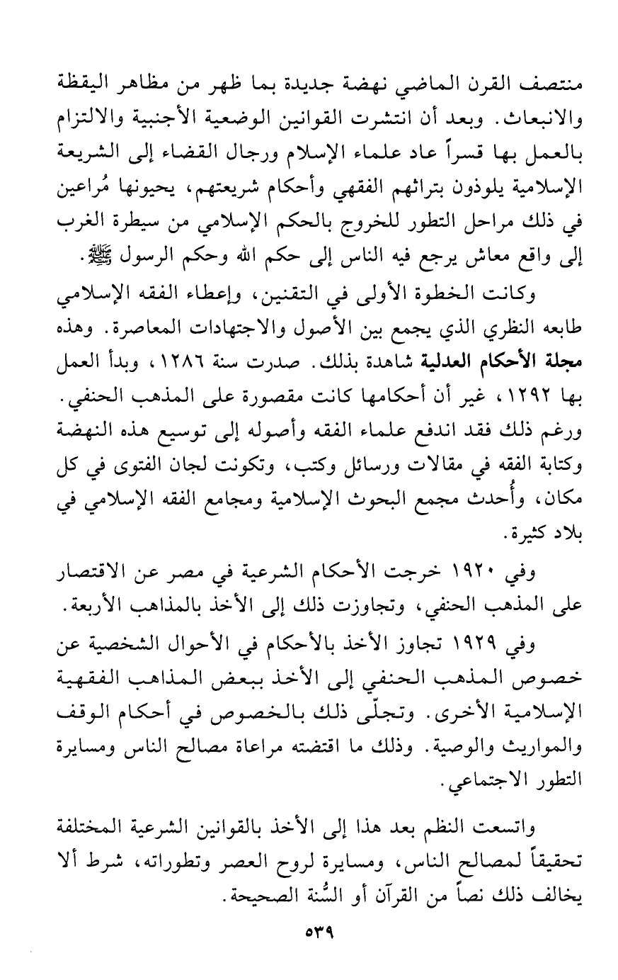 وكانت الخطوة الأولى في التقنين، وإعطاء الفقه الإسلامي طابعه النظري الذي يجمع بين الأصول والاجتهادات المعاصرة. وهذه مجلة الأحكام العدلية شاهدة بذلك. صدرت سنة 1286، وبدأ العمل بها 1292، غير أن أحكامها كانت مقصورة على المذهب الحنفي. ورغم ذلك فقد اندفع علماء الفقه وأصوله إلى توسيع هذه النهضة وكتابة الفقه في مقالات ورسائل وكتب، وتكونت لجان الفتوى في كل مكان، وأُحدث مجمع البحوث الإسلامية ومجامع الفقه الإسلامي في بلاد كثيرة.