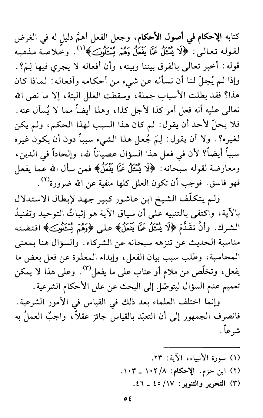 ولم يتكلّف الشيخ ابن عاشور كبير جهد لإبطال الاستدلال بالآية، واكتفى بالتنبيه على أن سياق الآية هو إثباتُ التوحيد وتفنيدُ الشرك. وأنَّ تقَدُّمَ {لَا يُسْأَلُ عَمَّا يَفْعَلُ} على {وَهُمْ يُسْأَلُونَ} اقتضته مناسبة الحديث عن تنزهه سبحانه عن الشركاء. والسؤال هنا بمعنى المحاسبة، وطلب سبب بيان الفعل، وإبداء المعذرة عن فعل بعض ما يفعل، وتخلّص من ملام أو عتاب على ما يفعل (¬3). وعلى هذا لا يمكن تعميم عدم السؤال ليتوصّل إلى البحث عن علل الأحكام الشرعية.