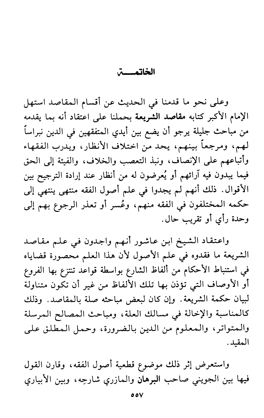 واعتقاد الشيخ ابن عاشور أنهم واجدون في علم مقاصد الشريعة ما فقدوه في علم الأصول لأن هذا العلم محصورة قضاياه في استنباط الأحكام من ألفاظ الشارع بواسطة قواعد تنتزع بها الفروع أو الأوصاف التي تؤذن بها تلك الألفاظ من غير أن تكون متناولة لبيان حكمة الشريعة. وإن كان لبعض مباحثه صلة بالمقاصد. وذلك كالمناسبة والإخالة في مسالك العلة، ومباحث المصالح المرسلة والمتواتر، والمعلوم من الدين بالضرورة، وحمل المطلق على المقيد.