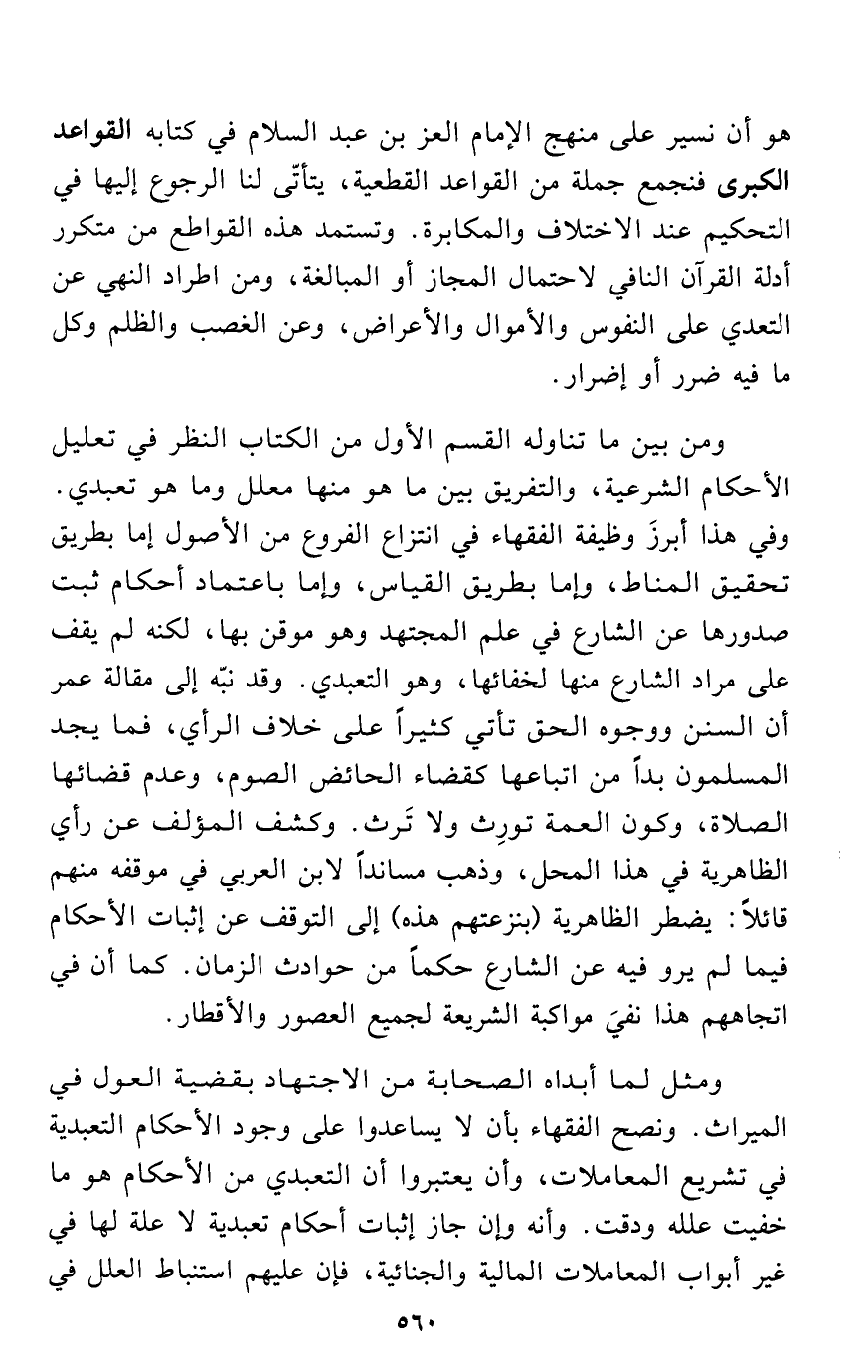 ومثل لما أبداه الصحابة من الاجتهاد بقضية العول في الميراث. ونصح الفقهاء بأن لا يساعدوا على وجود الأحكام التعبدية في تشريع المعاملات، وأن يعتبروا أن التعبدي من الأحكام هو ما خفيت علله ودقت. وأنه وإن جاز إثبات أحكام تعبدية لا علة لها في غير أبواب المعاملات المالية والجنائية، فإن عليهم استنباط العلل في