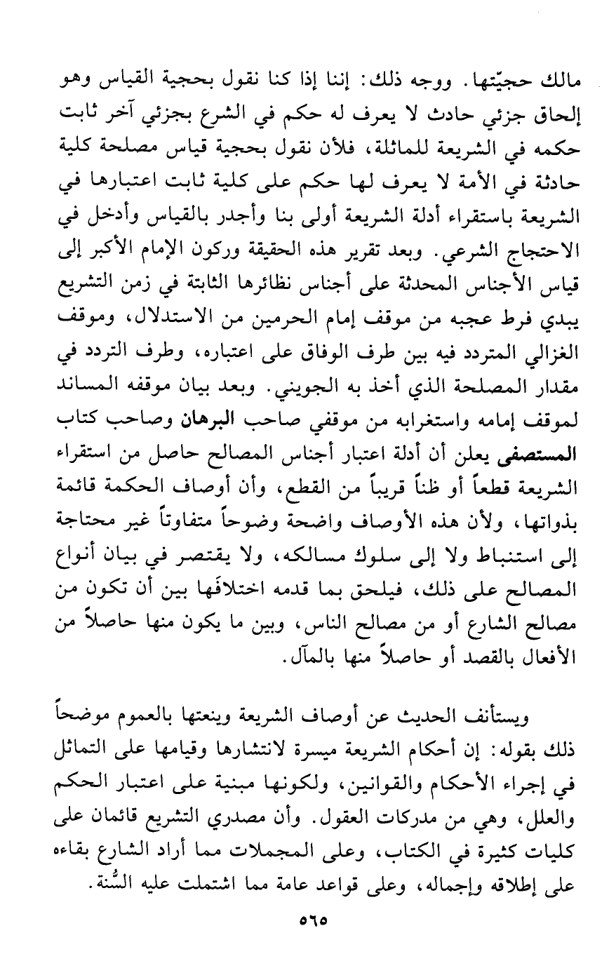 مالك حجيّتها. ووجه ذلك: إننا إذا كنا نقول بحجية القياس وهو إلحاق جزئي حادث لا يعرف له حكم في الشرع بجزئي آخر ثابت حكمه في الشريعة للماثلة، فلأن نقول بحجية قياس مصلحة كلية حادثة في الأمة لا يعرف لها حكم على كلية ثابت اعتبارها في الشريعة باستقراء أدلة الشريعة أولى بنا وأجدر بالقياس وأدخل في الاحتجاج الشرعي. وبعد تقرير هذه الحقيقة وركون الإمام الأكبر إلى قياس الأجناس المحدثة على أجناس نظائرها الثابتة في زمن التشريع يبدي فرط عجبه من موقف إمام الحرمين من الاستدلال، وموقف الغزالي المتردد فيه بين طرف الوفاق على اعتباره، وطرف التردد في مقدار المصلحة الذي أخذ به الجويني. وبعد بيان موقفه المساند لموقف إمامه واستغرابه من موقفي صاحب البرهان وصاحب كتاب المستصفى يعلن أن أدلة اعتبار أجناس المصالح حاصل من استقراء الشريعة قطعاً أو ظناً قريباً من القطع، وأن أوصاف الحكمة قائمة بذواتها، ولأن هذه الأوصاف واضحة وضوحاً متفاوتاً غير محتاجة إلى استنباط ولا إلى سلوك مسالكه، ولا يقتصر في بيان أنواع المصالح على ذلك، فيلحق بما قدمه اختلافَها بين أن تكون من مصالح الشارع أو من مصالح الناس، وبين ما يكون منها حاصلاً من الأفعال بالقصد أو حاصلاً منها بالمآل.