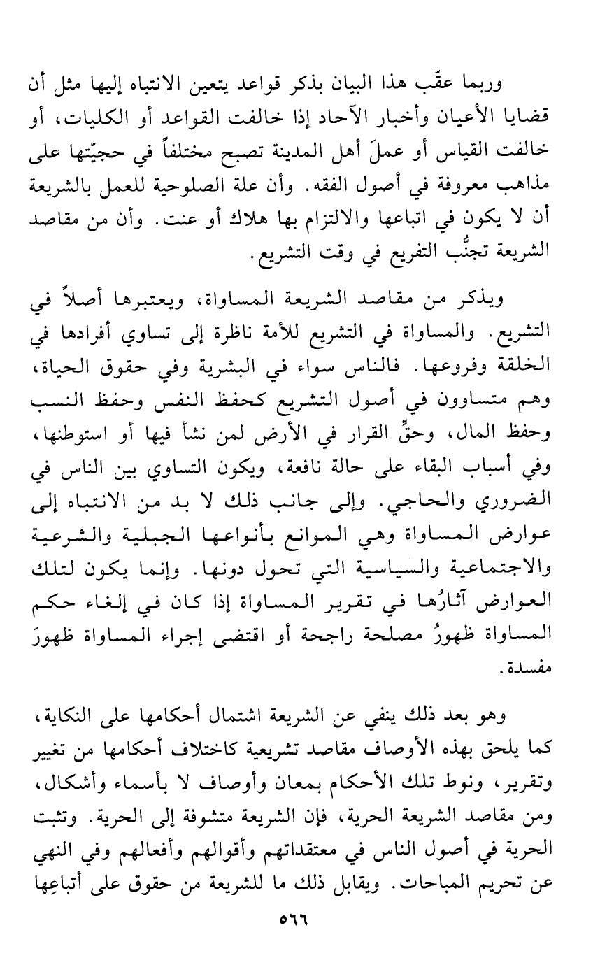 ويذكر من مقاصد الشريعة المساواة، ويعتبرها أصلاً في التشريع. والمساواة في التشريع للأمة ناظرة إلى تساوي أفرادها في الخلقة وفروعها. فالناس سواء في البشرية وفي حقوق الحياة، وهم متساوون في أصول التشريع كحفظ النفس وحفظ النسب وحفظ المال، وحقّ القرار في الأرض لمن نشأ فيها أو استوطنها، وفي أسباب البقاء على حالة نافعة، ويكون التساوي بين الناس في الضروري والحاجي. وإلى جانب ذلك لا بد من الانتباه إلى عوارض المساواة وهي الموانع بأنواعها الجبلية والشرعية والاجتماعية والسياسية التي تحول دونها. وإنما يكون لتلك العوارض آثارُها في تقرير المساواة إذا كان في إلغاء حكم المساواة ظهورُ مصلحة راجحة أو اقتضى إجراء المساواة ظهورَ مفسدة.