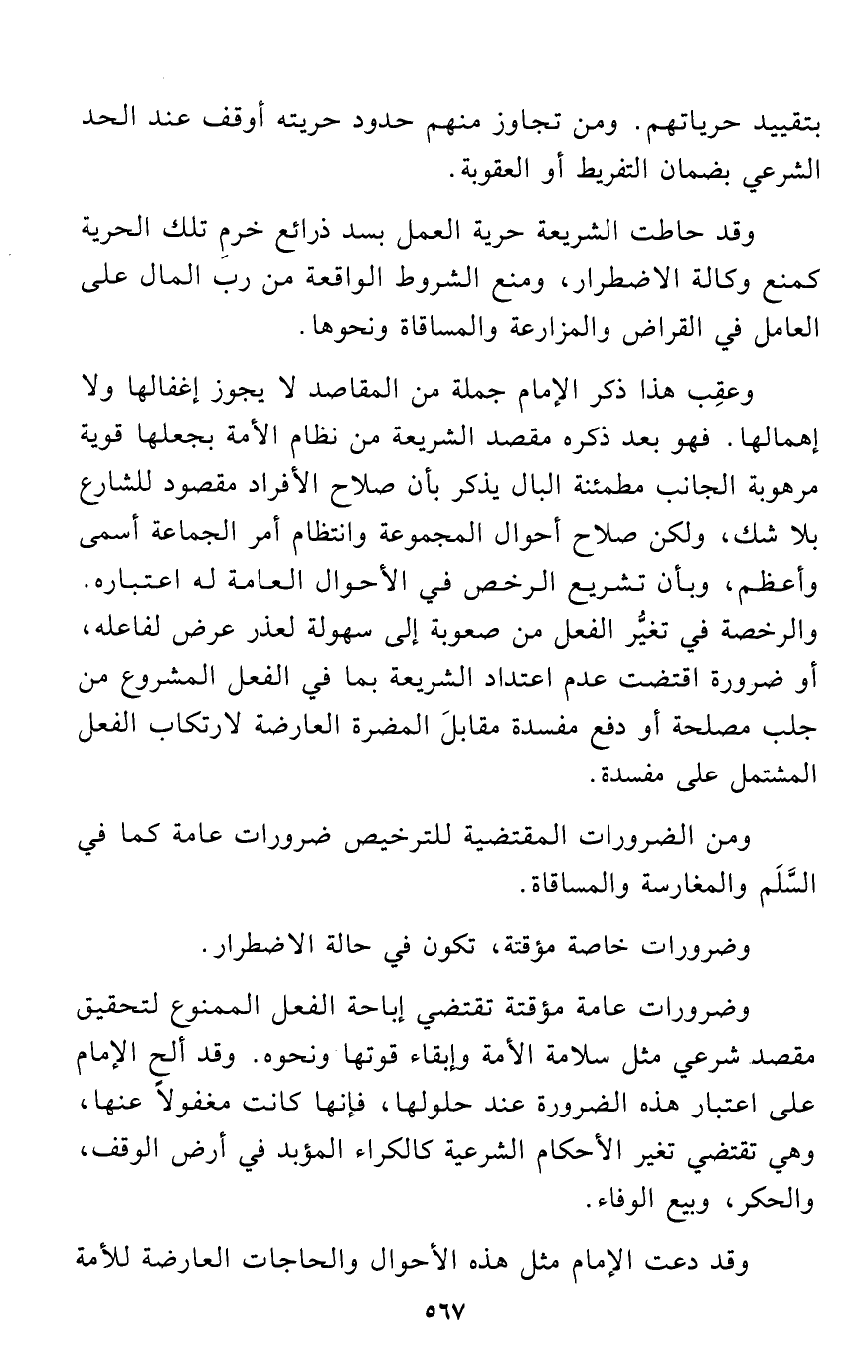 وضرورات عامة مؤقتة تقتضي إباحة الفعل الممنوع لتحقيق مقصد شرعي مثل سلامة الأمة وإبقاء قوتها ونحوه. وقد ألح الإمام على اعتبار هذه الضرورة عند حلولها، فإنها كانت مغفولاً عنها، وهي تقتضي تغير الأحكام الشرعية كالكراء المؤبد في أرض الوقف، والحكر، وبيع الوفاء.