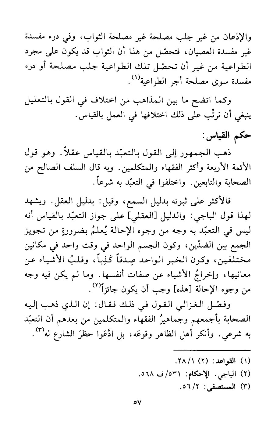وفصّل الغزالي القول في ذلك فقال: إن الذي ذهب إليه الصحابة بأجمعهم وجماهيرُ الفقهاء والمتكلمين من بعدهم أن التعبّد به شرعي. وأنكر أهل الظاهر وقوعَه، بل ادَّعَوا حظرَ الشارع له (¬3).