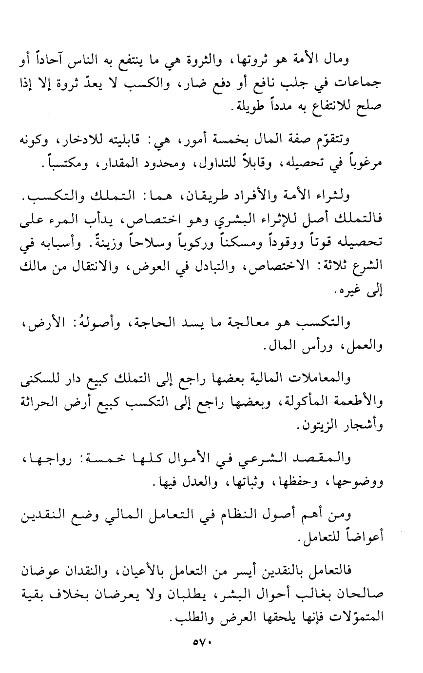 ومال الأمة هو ثروتها، والثروة هي ما ينتفع به الناس آحاداً أو جماعات في جلب نافع أو دفع ضار، والكسب لا يعدّ ثروة إلا إذا صلح للانتفاع به مدداً طويلة.