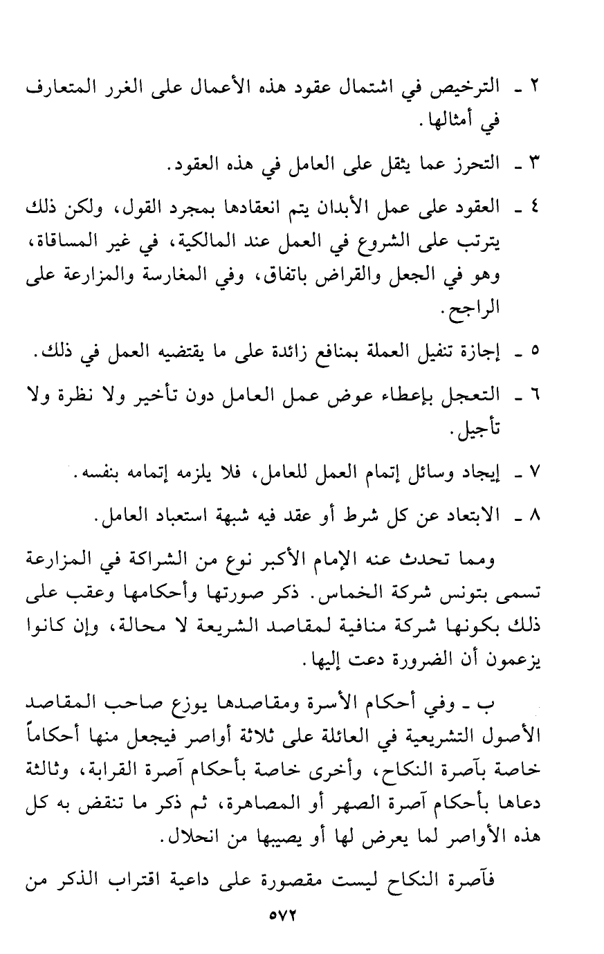ب - وفي أحكام الأسرة ومقاصدها يوزع صاحب المقاصد الأصول التشريعية في العائلة على ثلاثة أواصر فيجعل منها أحكاماً خاصة بآصرة النكاح، وأخرى خاصة بأحكام آصرة القرابة، وثالثة دعاها بأحكام آصرة الصهر أو المصاهرة، ثم ذكر ما تنقض به كل هذه الأواصر لما يعرض لها أو يصيبها من انحلال.