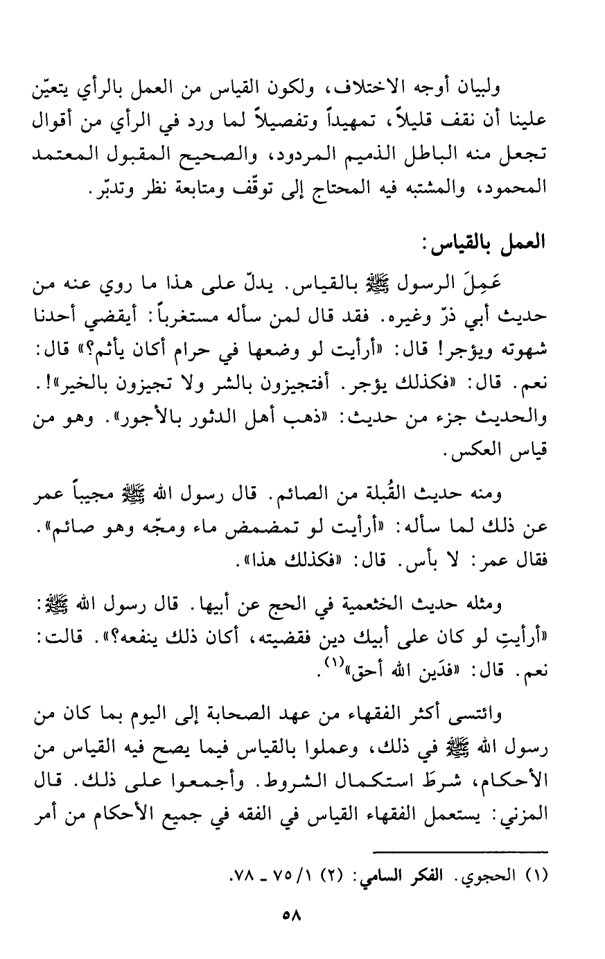عَمِلَ الرسول - صلى الله عليه وسلم - بالقياس. يدلّ على هذا ما روي عنه من حديث أبي ذرّ وغيره. فقد قال لمن سأله مستغرباً: أيقضي أحدنا شهوته ويؤجر! قال: "أرأيت لو وضعها في حرام أكان يأثم؟ " قال: نعم. قال: "فكذلك يؤجر. أفتجيزون بالشر ولا تجيزون بالخير"!. والحديث جزء من حديث: "ذهب أهل الدثور بالأجور". وهو من قياس العكس.