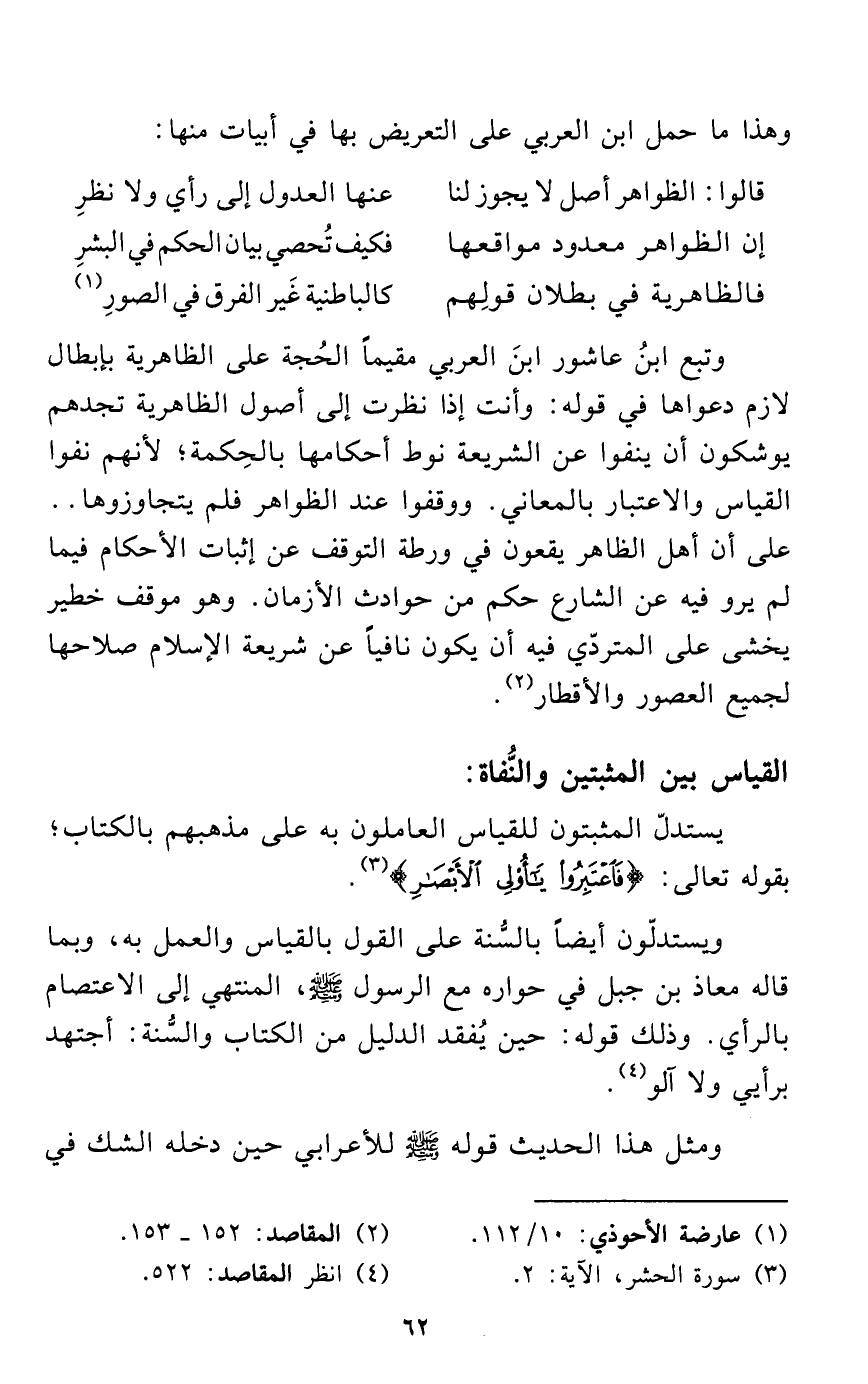 وتبع ابنُ عاشور ابنَ العربي مقيماً الحُجة على الظاهرية بإبطال لازم دعواها في قوله: وأنت إذا نظرت إلى أصول الظاهرية تجدهم يوشكون أن ينفوا عن الشريعة نوط أحكامها بالحِكمة؛ لأنهم نفوا القياس والاعتبار بالمعاني. ووقفوا عند الظواهر فلم يتجاوزوها .. على أن أهل الظاهر يقعون في ورطة التوقف عن إثبات الأحكام فيما لم يرو فيه عن الشارع حكم من حوادث الأزمان. وهو موقف خطير يخشى على المتردّي فيه أن يكون نافياً عن شريعة الإسلام صلاحها لجميع العصور والأقطار (¬2).