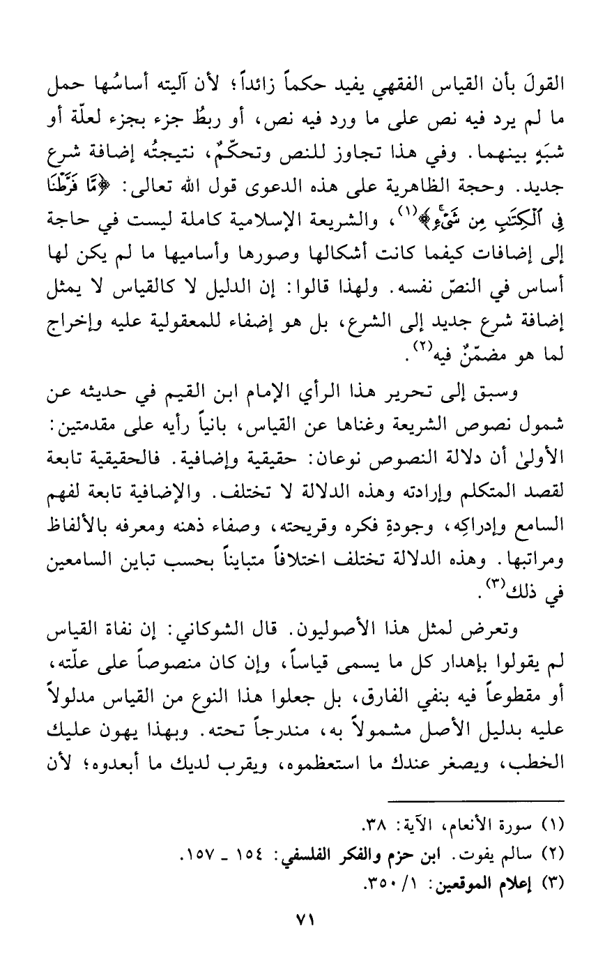 القولَ بأن القياس الفقهي يفيد حكماً زائداً؛ لأن آليته أساسُها حمل ما لم يرد فيه نص على ما ورد فيه نص، أو ربطُ جزء بجزء لعلّة أو شبَهٍ بينهما. وفي هذا تجاوز للنص وتحكّمٌ، نتيجتُه إضافة شرع جديد. وحجة الظاهرية على هذه الدعوى قول الله تعالى: {مَا فَرَّطْنَا فِي الْكِتَابِ مِنْ شَيْءٍ} (¬1)، والشريعة الإسلامية كاملة ليست في حاجة إلى إضافات كيفما كانت أشكالها وصورها وأساميها ما لم يكن لها أساس في النص نفسه. ولهذا قالوا: إن الدليل لا كالقياس لا يمثل إضافة شرع جديد إلى الشرع، بل هو إضفاء للمعقولية عليه وإخراج لما هو مضمّنٌ فيه (¬2).
