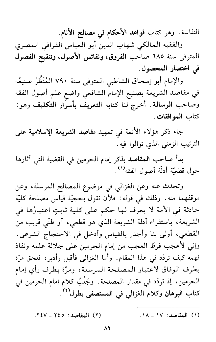 وتحدث عنه وعن الغزالي في موضوع المصالح المرسلة، وعن موقفهما منه. وذلك في قوله: فلأن نقول بحجيّة قياس مصلحة كليّة حادثة في الأمة لا يعرف لها حكم على كلية ثابتٍ اعتبارُها في الشريعة، باستقراء أدلة الشريعة الذي هو قطعي، أو ظنّي قريب من القطعي، أولى بنا وأجدر بالقياس وأدخل في الاحتجاج الشرعي. وإني لأعجب فرطَ العجب من إمام الحرمين على جلالة علمه ونفاذ فهمه كيف تردّد في هذا المقام. وأما الغزالي فأقبل وأدبر، فلحق مرّة بطرف الوفاق لاعتبار المصلحة المرسلة، ومرّة بطرف رأي إمام الحرمين، إذ تردّد في مقدار المصلحة. وجَلْبُ كلام إمام الحرمين في كتاب البرهان وكلام الغزالي في المستصفى يطول (¬2).
