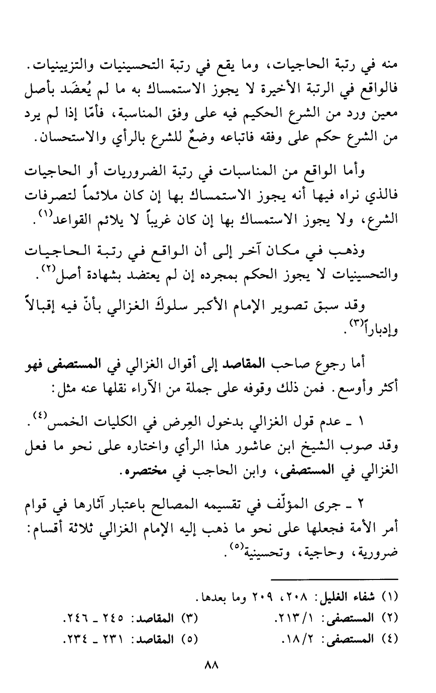 2 - جرى المؤلّف في تقسيمه المصالح باعتبار آثارها في قوام أمر الأمة فجعلها على نحو ما ذهب إليه الإمام الغزالي ثلاثة أقسام: ضرورية، وحاجية، وتحسينية (¬5).