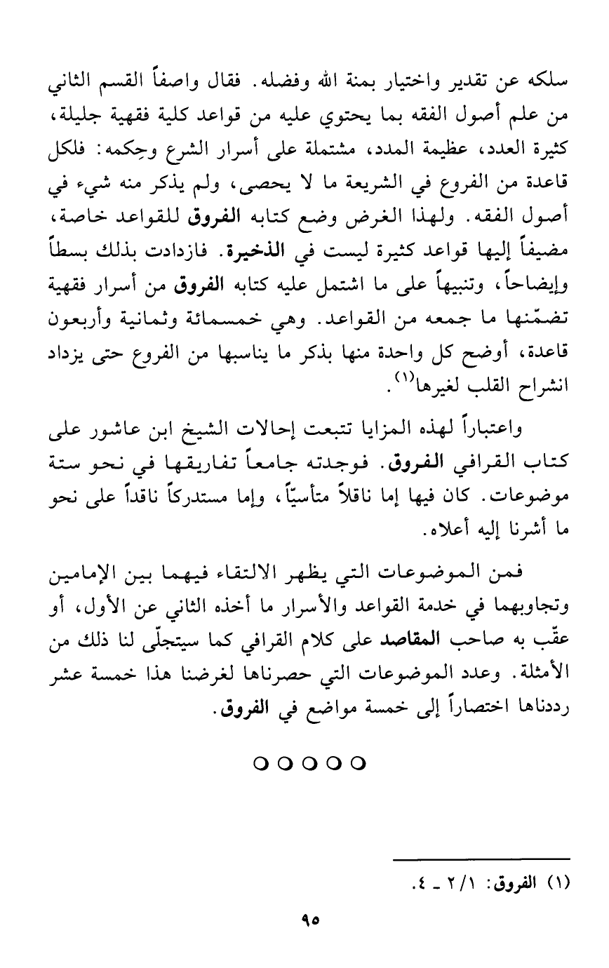 واعتباراً لهذه المزايا تتبعت إحالات الشيخ ابن عاشور على كتاب القرافي الفروق. فوجدته جامعاً تفاريقها في نحو ستة موضوعات. كان فيها إما ناقلاً متأسيّاً، وإما مستدركاً ناقداً على نحو ما أشرنا إليه أعلاه.