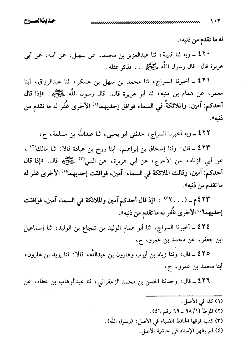421- أخبرنا السراج، ثنا محمد بن سهل بن عسكر، ثنا عبد الرزاق، أبنا معمر، عن همام بن منبه، ثنا أبو هريرة قال: قال رسول الله صلى الله عَلَيْهِ وَسَلَّمَ: ((إِذَا قَالَ أَحَدُكُمْ: آمِينَ. وَالْمَلائِكَةُ في السماء فوافق إحديهما الأُخْرَى غُفِرَ لَهُ مَا تَقَدَّمَ مِنْ ذَنْبِهِ)) .