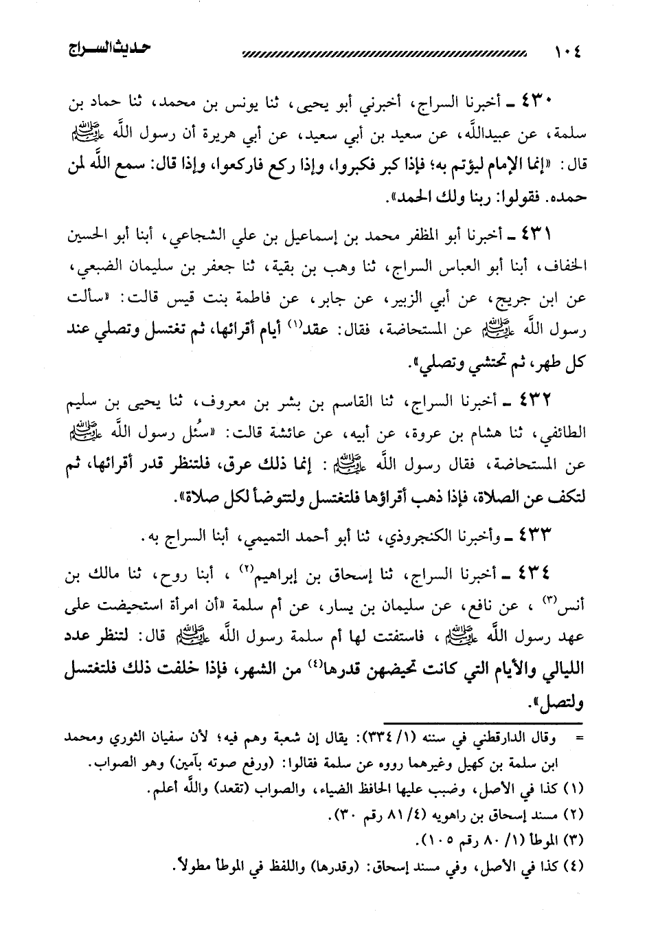 434- أخبرنا السراج، ثنا إسحاق بن إبراهيم، أبنا روح، ثنا مالك بن أنس، عن نافع، عن سُلَيْمَانَ بْنِ يَسَارٍ، عَنْ أُمِّ سَلَمَةَ ((أَنَّ امْرَأَةً اسْتُحِيضَتْ عَلَى عَهْدِ رَسُولِ اللَّهِ صَلَّى الله عليه وسلم، فاستفت لَهَا أُمُّ سَلَمَةَ رَسُولَ اللَّهِ صَلَّى اللَّهُ عَلَيْهِ وَسَلَّمَ قَالَ: لِتَنْظُرْ عَدَدَ اللَّيَالِي وَالأَيَّامِ الَّتِي كَانَتْ تَحِيضُهُنَّ قَدْرَهَا مِنَ الشَّهْرِ، فَإِذَا خَلَفَتْ ذَلِكَ فَلْتَغْتَسِلْ وَلْتُصَلِّ)) .