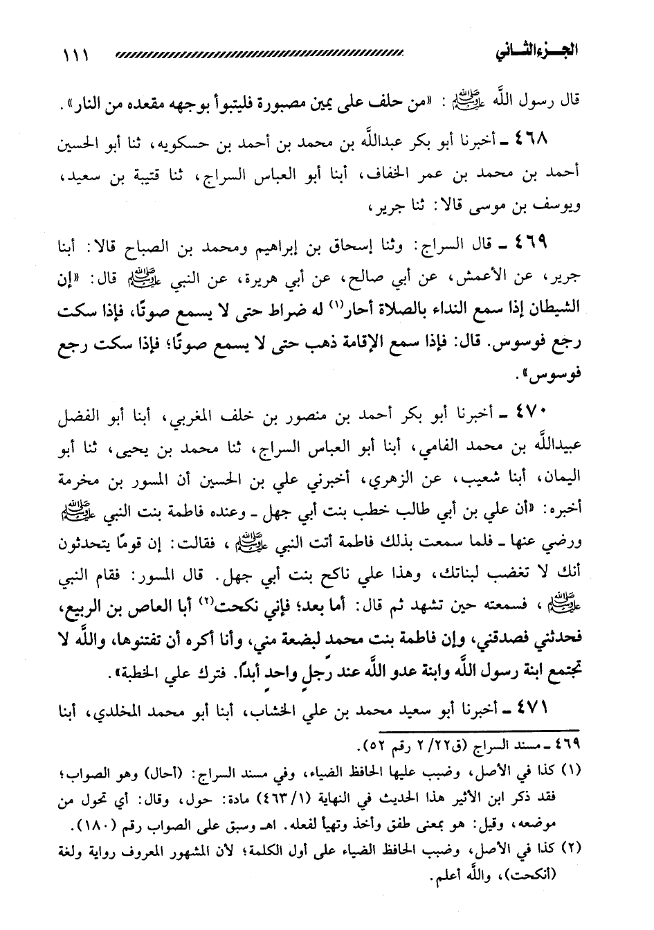469- قَالَ السَّرَّاجُ: وَثَنَا إِسْحَاقُ بْنُ إِبْرَاهِيمَ ومحمد بن الصباح قالا: أبنا جَرِيرٌ، عَنِ الأَعْمَشِ، عَنْ أَبِي صَالِحٍ، عَنْ أبي هريرة، عن النبي صلى الله عليه وَسَلَّمَ قَالَ: ((إِنَّ الشَّيْطَانَ إِذَا سَمِعَ النِّدَاءَ بِالصَّلاةِ أَحَارَ لَهُ ضُرَاطٌ حَتَّى لا يَسْمَعَ صَوْتًا، فَإِذَا سَكَتَ رَجَعَ فَوَسْوَسَ. قَالَ: فَإِذَا سَمِعَ الإِقَامَةَ ذَهَبَ حَتَّى لا يَسْمَعَ صَوْتًا؛ فَإِذَا سَكَتَ رَجَعَ فَوَسْوَسَ)) .