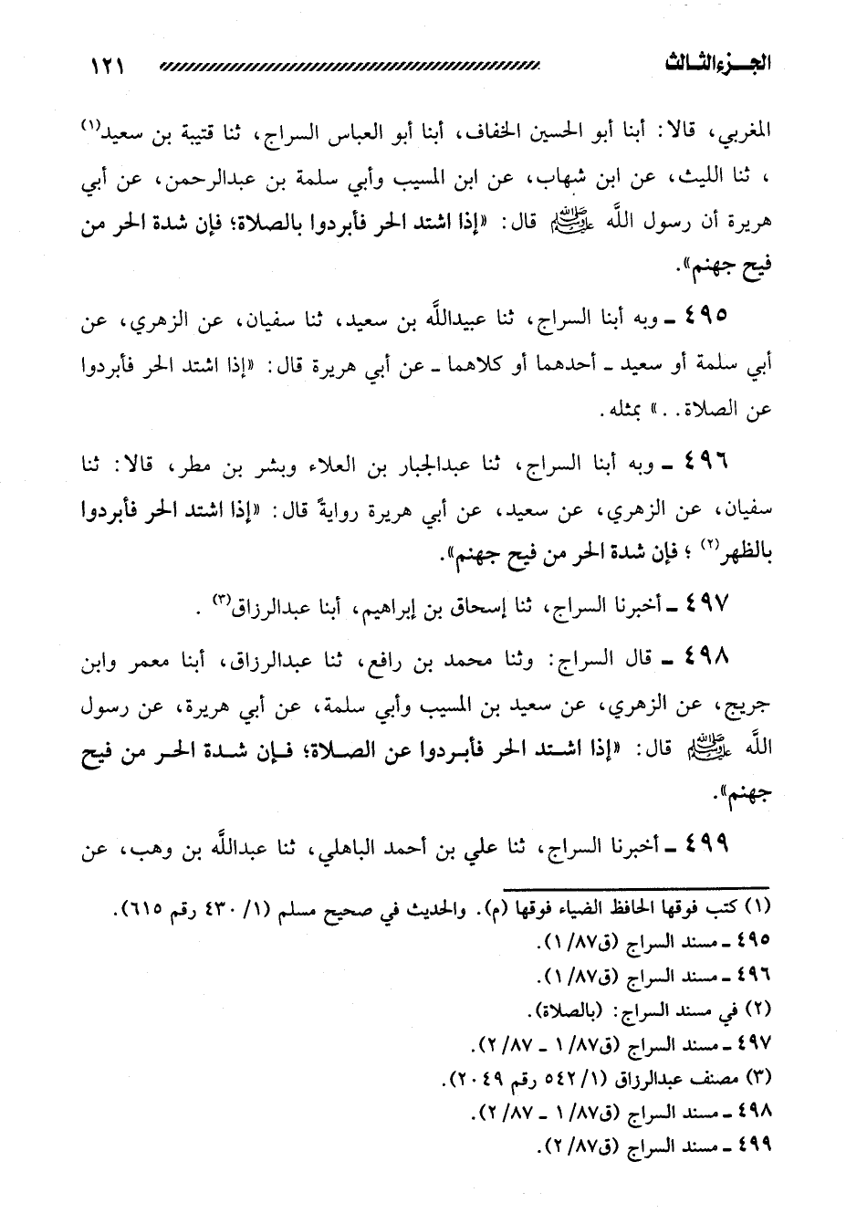 498- قَالَ السَّرَّاجُ: وَثَنَا مُحَمَّدُ بْنُ رافع، ثنا عبد الرزاق، أبنا مَعْمَرٌ وَابْنُ جُرَيْجٍ، عَنِ الزُّهْرِيِّ، عَنْ سَعِيدِ بْنِ الْمُسَيِّبِ وَأَبِي سَلَمَةَ، عَنْ أَبِي هُرَيْرَةَ، عن رسول الله صلى الله عليه وسلم قَالَ: ((إِذَا اشْتَدَّ الْحَرُّ فَأَبْرِدُوا عَنِ الصَّلاةِ؛ فَإِنَّ شِدَّةَ الْحَرِّ مِنْ فَيْحِ جَهَنَّمَ)) .