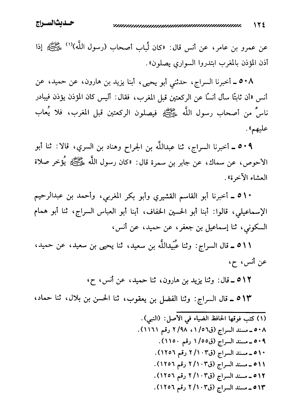 508- أخبرنا السراج، حدثني أبو يحيى، أبنا يَزِيدُ بْنُ هَارُونَ، عَنْ حُمَيْدٍ، عَنْ أَنَسٍ ((أَنَّ ثَابِتًا سَأَلَ أَنَسًا عَنِ الرَّكْعَتَيْنِ قَبْلَ المغرب، فقال: أليس كان المؤذن يؤذن فيبادر ناسٌ مِنْ أَصْحَابِ رَسُولِ اللَّهِ صَلَّى اللَّهُ عَلَيْهِ وَسَلَّمَ فَيُصَلُّونَ الرَّكْعَتَيْنِ قَبْلَ الْمَغْرِبِ، فَلا يعاب عليهم)) .