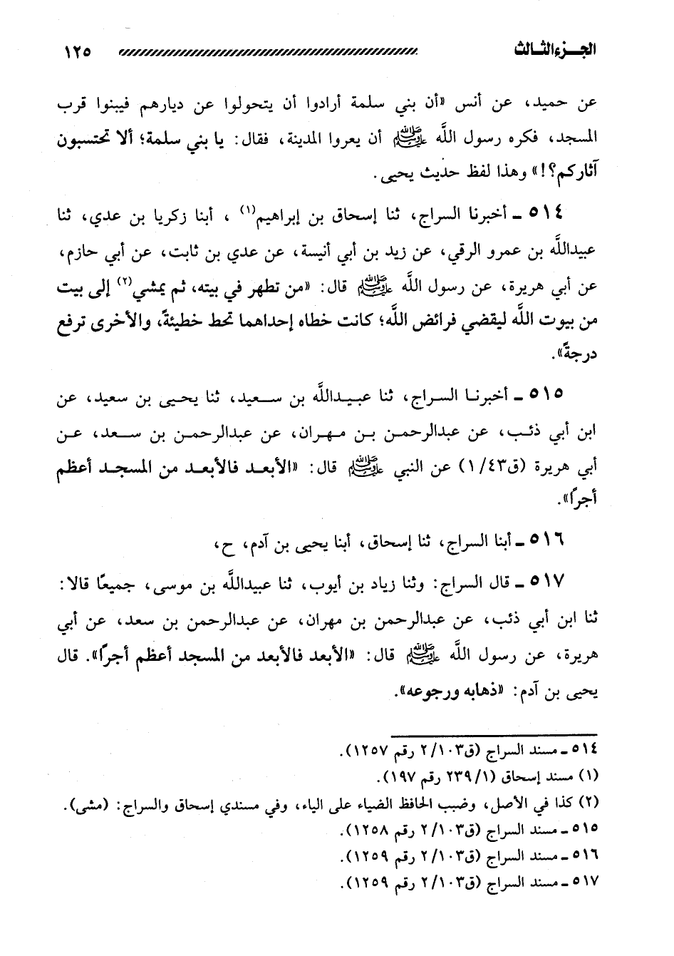 517- قَالَ السَّرَّاجُ: وَثَنَا زياد بن أيوب، ثنا عبيد الله بن مُوسَى، جَمِيعًا قَالا: ثَنَا ابْنُ أَبِي ذِئْبٍ، عَنْ عَبْدِ الرَّحْمَنِ بْنِ مِهْرَانَ، عَنْ عَبْدِ الرحمن بن سعد، عن أبي هريرة، عن رسول الله صلى الله عليه وسلم قال: ((الأبعد فالأبعد مِنَ الْمَسْجِدِ أَعْظَمُ أَجْرًا)) . قَالَ يَحْيَى بْنُ آدَمَ: ((ذَهَابُهُ وَرُجُوعُهُ)) .