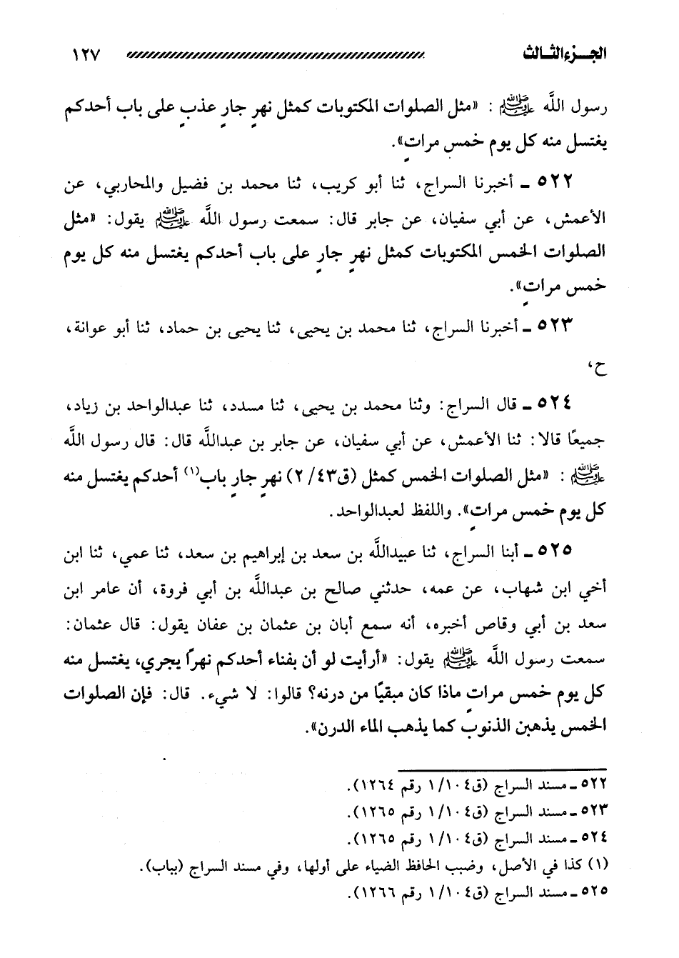 524- قال السراج: وثنا محمد بن يحيى، ثنا مُسَدِّدٌ، ثَنَا عَبْدُ الْوَاحِدِ بْنُ زِيَادٍ، جَمِيعًا قَالا: ثَنَا الأَعْمَشُ، عَنْ أَبِي سُفْيَانَ، عَنْ جَابِرِ بْنِ عَبْدِ اللَّهِ قَالَ: قَالَ رَسُولُ اللَّهِ صَلَّى اللَّهُ عَلَيْهِ وَسَلَّمَ: ((مَثَلُ الصَّلَوَاتِ الْخَمْسِ كَمَثَلِ نهرٍ جارٍ بِبَابِ أَحَدِكُمْ يَغْتَسِلُ مِنْهُ كُلَّ يَوْمٍ خَمْسَ مراتٍ)) . وَاللَّفْظُ لِعَبْدِ الواحد.