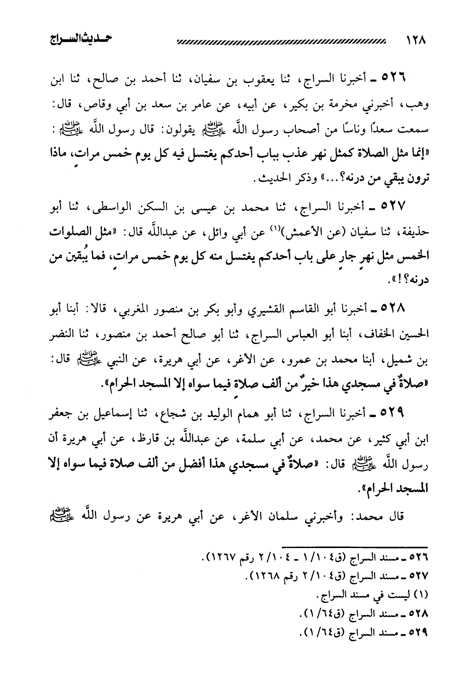 528- أَخْبَرَنَا أَبُو الْقَاسِمِ الْقُشَيْرِيُّ وَأَبُو بَكْرِ بْنُ منصور المغربي، قالا: أبنا أبو الحسين الخفاف، أبنا أبو العباس السراج، ثنا أبو صالح أحمد بن منصور، ثنا النضر بن شميل، أبنا مُحَمَّدُ بْنُ عَمْرٍو، عَنِ الأَغَرِّ، عَنْ أَبِي هريرة، عن النبي صلى الله عليه وسلم قَالَ: ((صلاةٌ فِي مَسْجِدِي هَذَا خيرٌ مِنْ أَلْفِ صلاةٍ فِيمَا سِوَاهُ إِلا الْمَسْجِدَ الْحَرَامَ)) .