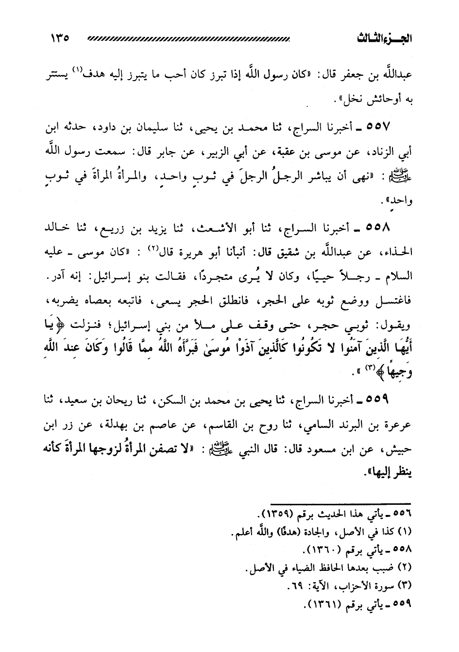 558- أَخْبَرَنَا السَّرَّاجُ، ثنا أَبُو الأَشْعَثِ، ثنا يَزِيدُ بْنُ زُرَيْعٍ، ثنا خَالِدٌ الْحَذَّاءُ، عَنْ عَبْدِ اللَّهِ بْنِ شَقِيقٍ قَالَ: أَنْبَأَنَا أَبُو هُرَيْرَةَ قَالَ: ((كَانَ مُوسَى -عَلَيْهِ السَّلامُ- رَجُلا حَيِيًّا، وَكَانَ لا يُرَى مُتَجَرِّدًا، فَقَالَتْ بَنُو إِسْرَائِيلَ: إنه آدر. فاغتسل ووضع ثَوْبَهُ عَلَى الْحَجَرِ، فَانْطَلَقَ الْحَجَرُ يَسْعَى، فَاتَّبَعَهُ بِعَصَاهُ يَضْرِبُهُ، وَيَقُولُ: ثَوْبِي حَجَرُ، حَتَّى وَقَفَ على ملأ من بني إسرائيل؛ فنزلت {يا أيها الَّذِينَ آمَنُوا لا تَكُونُوا كَالَّذِينَ آذَوْا مُوسَى فَبَرَّأَهُ اللَّهُ مِمَّا قَالُوا وَكَانَ عِنْدَ اللَّهِ وجيهاً} )) .