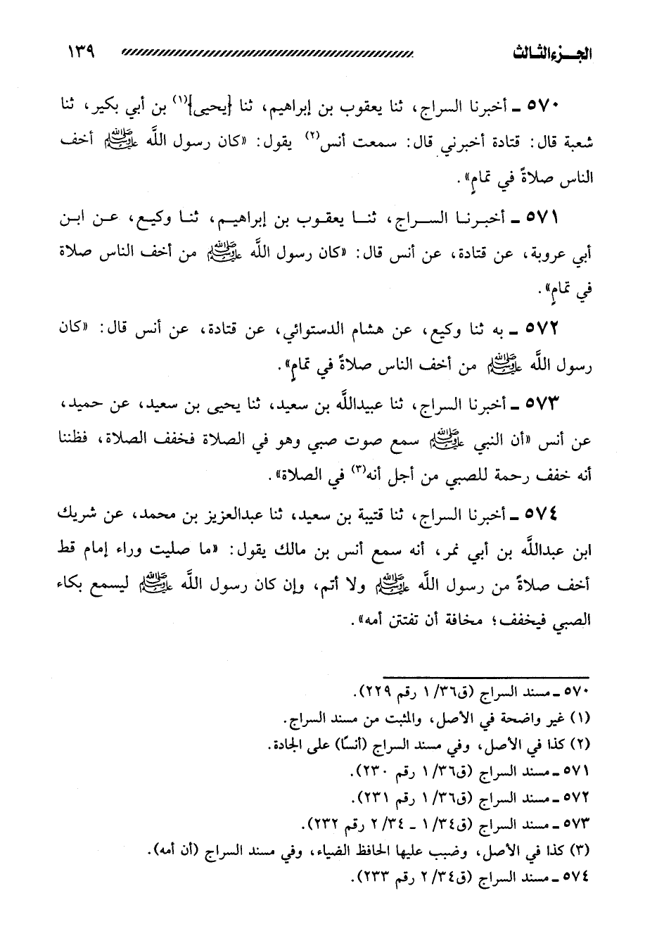573- أخبرنا السراج، ثنا عبيد الله بن سعيد، ثنا يحيى بن سعيد، عن حميد، عن أنس ((أن النبي صلى الله عليه وسلم سَمِعَ صَوْتَ صَبِيٍّ وَهُوَ فِي الصَّلاةِ فَخَفَّفَ الصلاة، فظننا أَنَّهُ خَفَّفَ رَحْمَةً لِلصَّبِيِّ مِنْ أَجْلِ أَنَّهُ في الصلاة)) .