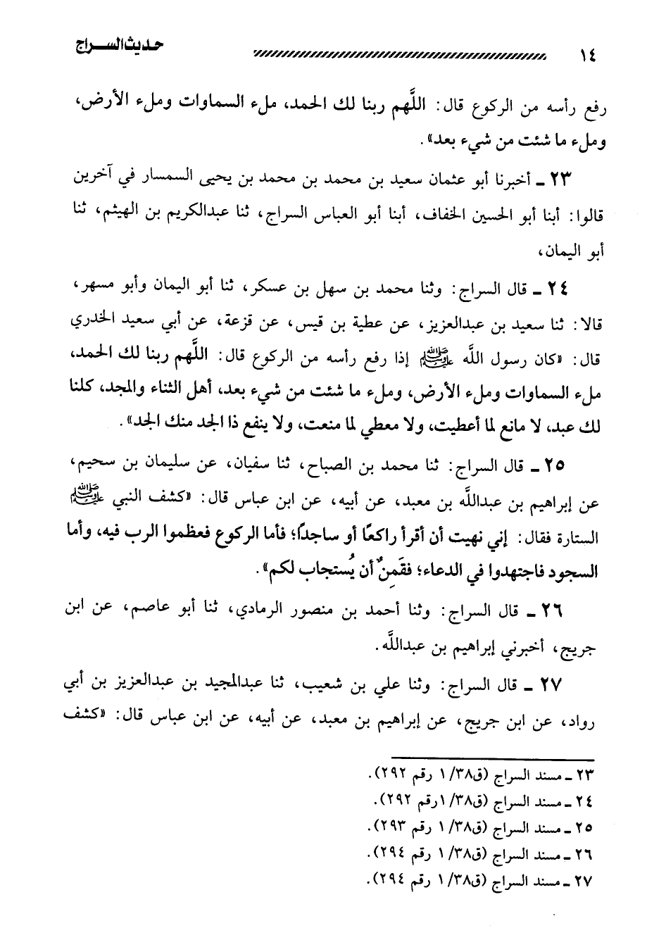 25- قَالَ السَّرَّاجُ: ثَنَا مُحَمَّدُ بْنُ الصَّبَّاحِ، ثَنَا سُفْيَانُ، عَنْ سُلَيْمَانَ بْنِ سُحَيْمٍ، عَنْ إِبْرَاهِيمَ بن عبد الله بن معبد، عن أبيه، عَنِ ابْنِ عَبَّاسٍ قَالَ: ((كَشَفَ النَّبِيُّ صَلَّى اللَّهُ عَلَيْهِ وَسَلَّمَ السِّتَارَةَ فَقَالَ: إِنِّي نُهِيتُ أَنْ أَقْرَأَ رَاكِعًا أَوْ سَاجِدًا؛ فَأَمَّا الرُّكُوعُ فَعَظِّمُوا الرَّبَّ فِيهِ، وَأَمَّا السُّجُودُ فَاجْتَهِدُوا فِي الدُّعَاءِ فقمنٌ أَنْ يُسْتَجَابَ لَكُمْ)) .