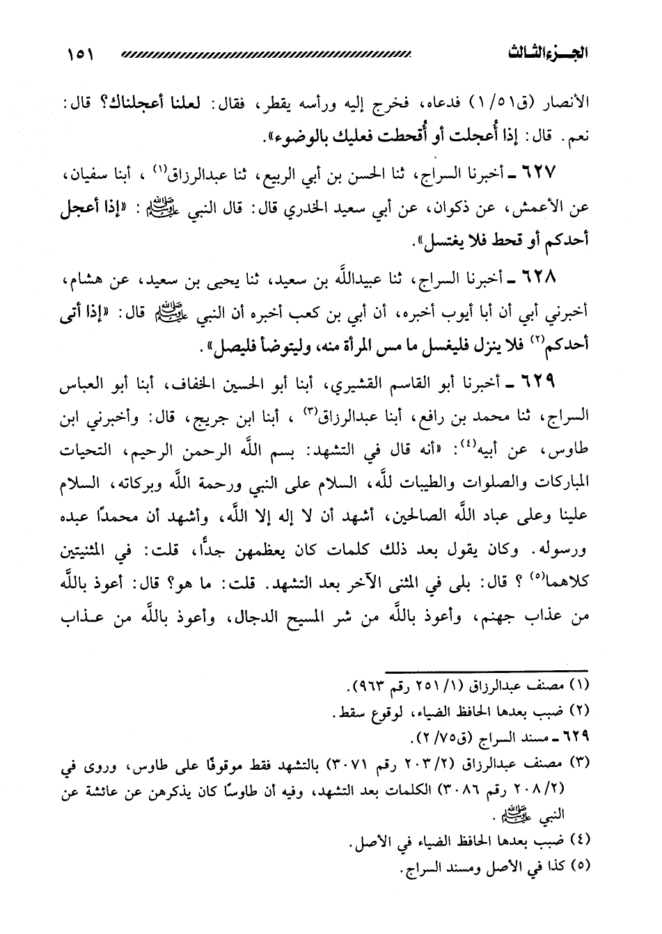 628- أخبرنا السراج، ثنا عبيد الله بن سعيد، ثنا يحيي بن سعيد، عن هشام، أخبرني أَبِي أَنَّ أَبَا أَيُّوبَ أَخْبَرَهُ، أَنَّ أُبَيَّ بن كعب أخبره أن النبي صلى الله عَلَيْهِ وَسَلَّمَ قَالَ: ((إِذَا أَتَى أَحَدُكُمْ فَلا ينزل فليغسل ما مس المرأة منه، وليتوضأ فليصل)) .