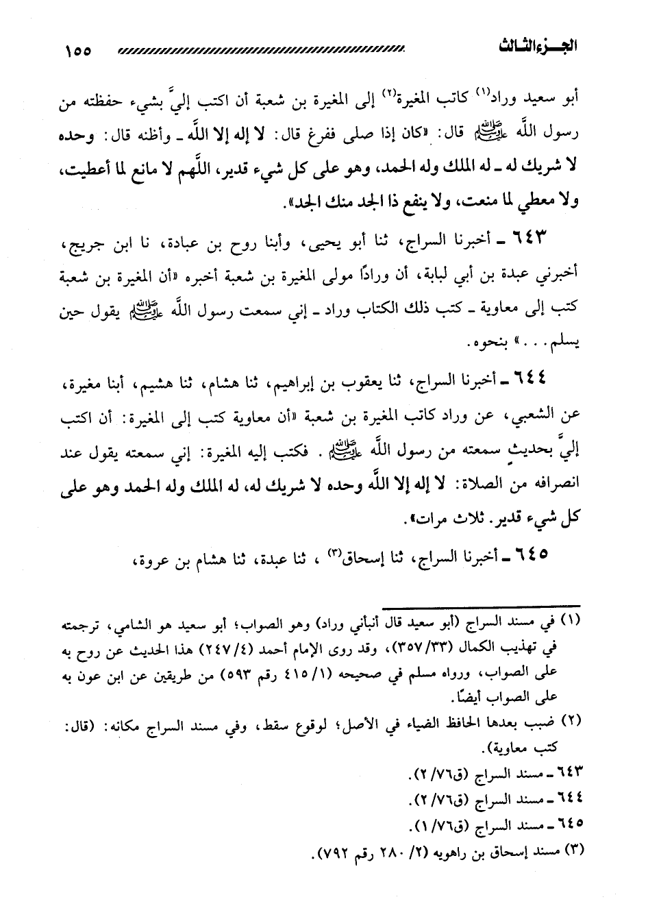 644- أخبرنا السراج، ثنا يعقوب بن إبراهيم، ثنا هشام، ثنا هشيم، أبنا مُغِيرَةُ، عَنِ الشَّعْبِيِّ، عَنْ وَرَّادٍ كَاتِبِ الْمُغِيرَةِ بْنِ شُعْبَةَ ((أَنَّ مُعَاوِيَةَ كَتَبَ إِلَى الْمُغِيرَةِ: أَنِ اكْتُبْ إِلَيَّ بحديثٍ سَمِعْتَهُ مِنْ رَسُولِ اللَّهِ صَلَّى اللَّهُ عَلَيْهِ وَسَلَّمَ. فَكَتَبَ إِلَيْهِ الْمُغِيرَةُ: أَنِّي سَمِعْتُهُ يَقُولُ عِنْدَ انْصِرَافِهِ مِنَ الصَّلاةِ: لا إِلَهَ إِلا اللَّهُ وَحْدَهُ لا شَرِيكَ لَهُ، لَهُ الْمُلْكُ وَلَهُ الْحَمْدُ وَهُوَ عَلَى كُلِّ شَيْءٍ قَدِيرٌ. ثَلاثَ مَرَّاتٍ)) .