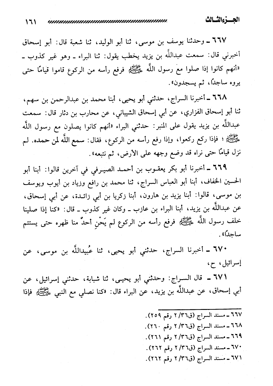 671- قَالَ السَّرَّاجُ: وَحَدَّثَنِي أَبُو يَحْيَى، ثنا شَبَابَةُ، حَدَّثَنِي إِسْرَائِيلُ، عَنْ أَبِي إِسْحَاقَ، عَنْ عَبْدِ اللَّهِ بْنِ يَزِيدَ، عَنِ الْبَرَاءِ قَالَ: ((كُنَّا نُصَلِّي مَعَ النَّبِيِّ صَلَّى اللَّهُ عَلَيْهِ وَسَلَّمَ فَإِذَا -[162]- قَالَ: سَمِعَ اللَّهُ لِمَنْ حَمِدَهُ. لَمْ يَحْنِ رجلٌ مِنَّا ظَهْرَهُ حَتَّى يَضَعَ رَسُولُ اللَّهِ صَلَّى اللَّهُ عَلَيهِ وَسَلَّمَ جَبْهَتَهُ عَلَى الأَرْضِ)) .