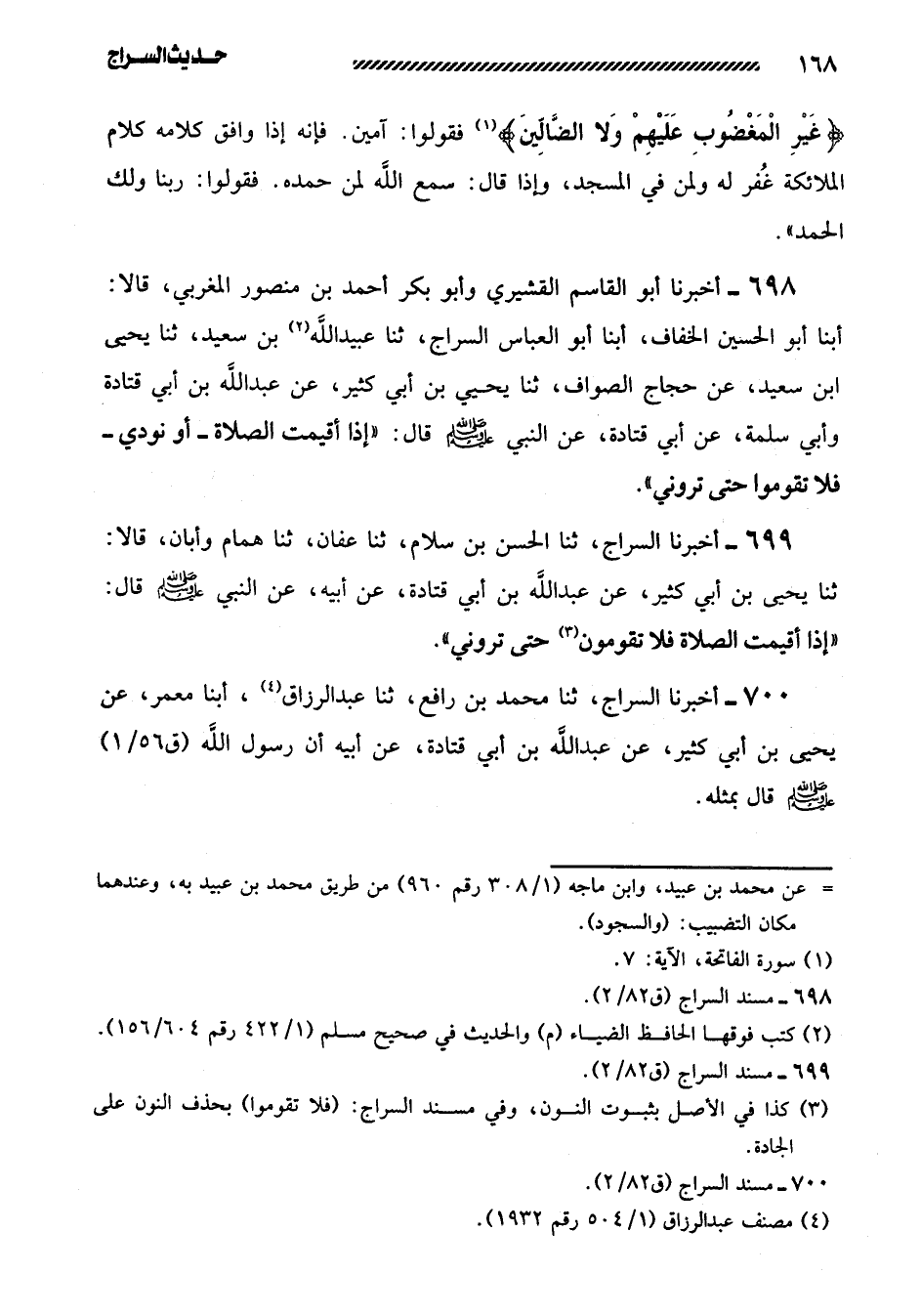 699- أخبرنا السراج، ثنا الحسن بن سلام، ثنا عفان، ثنا همام وأبان، قالا: ثنا يحيي بن أبي كثير، عن عبد اللَّهِ بْنِ أَبِي قَتَادَةَ، عَنْ أَبِيهِ، عَنِ النبي صلى الله عليه وسلم قال: ((إذا أقيمت الصلاة فلا تقومون حتى تروني)) .