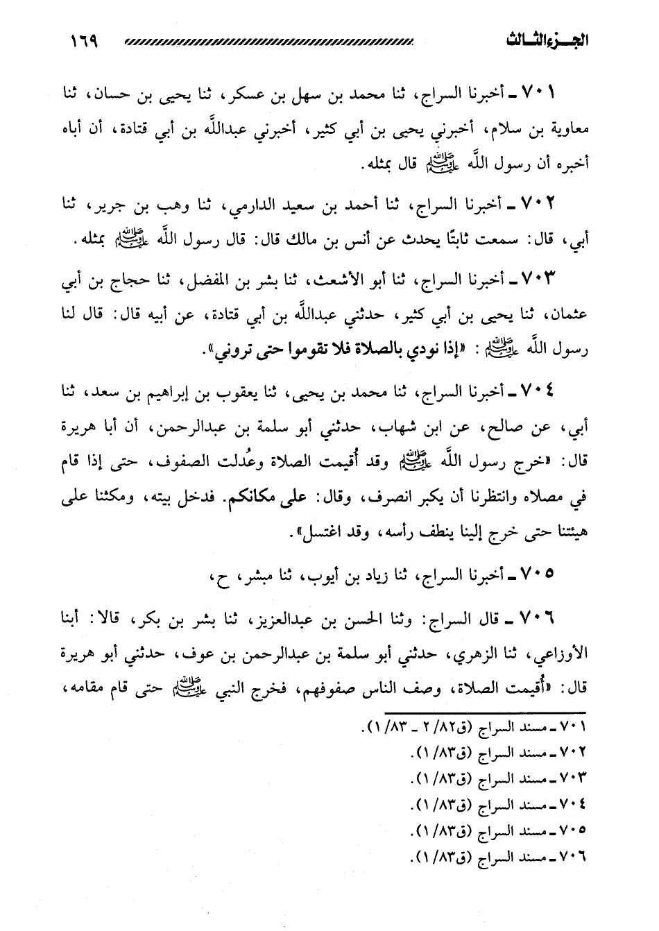 701- أخبرنا السراج، ثنا محمد بن سهل بن عسكر، ثنا يحيى بن حسان، ثنا معاوية بْنُ سَلامٍ، أَخْبَرَنِي يَحْيَى بْنُ أَبِي كَثِيرٍ، أَخْبَرَنِي عَبْدُ اللَّهِ بْنُ أَبِي قَتَادَةَ، أَنَّ أَبَاهُ أَخْبَرَهُ أَنَّ رَسُولَ اللَّهِ صَلَّى اللَّهُ عَلَيهِ وَسَلَّمَ قَالَ بِمِثْلِهِ.