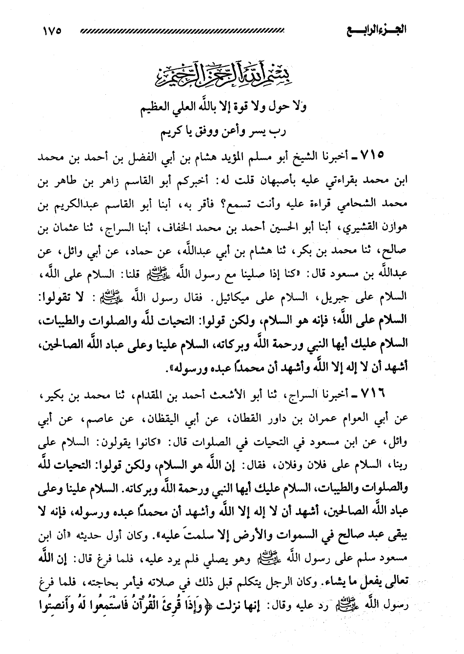 715- أَخْبَرَنَا الشَّيْخُ أَبُو مسلم المؤيد هشام بن أبي الفضل بن أحمد بن محمد ابن مُحَمَّدٍ بِقِرَاءَتِي عَلَيْهِ بِأَصْبَهَانَ قُلْتُ لَهُ: أَخْبَرَكُمْ أَبُو الْقَاسِمِ زَاهِرُ بْنُ طَاهِرِ بْنِ مُحَمَّدٍ الشَّحَّامِيُّ قِرَاءَةً عَلَيْهِ وَأَنْتَ تَسْمَعُ؟ فَأَقَرَّ بِهِ، أبنا أَبُو الْقَاسِمِ عَبْدُ الْكَرِيمِ بْنُ هَوَازِنَ الْقُشَيْرِيُّ، أبنا أبو الحسين أحمد بن محمد الخفاف أبنا السَّرَّاجُ، ثنا عُثْمَانُ بْنُ صَالِحٍ، ثنا مُحَمَّدُ بْنُ بَكْرٍ، ثنا هِشَامُ بْنُ أَبِي عَبْدِ اللَّهِ، عَنْ حَمَّادٍ، عَنْ أَبِي وَائِلٍ، عَنْ عَبْدِ اللَّهِ بْنِ مَسْعُودٍ قَالَ: ((كُنَّا إِذَا صلينا مع رسول الله صلى الله عليه وَسَلَّمَ قُلْنَا: السَّلامُ عَلَى اللَّهِ، السَّلامُ عَلَى جِبْرِيلَ، السَّلامُ عَلَى مِيكَائِيلَ. فَقَالَ رَسُولُ اللَّهِ صَلَّى اللَّهُ عَلَيهِ وَسَلَّمَ: لا تَقُولُوا: السَّلامُ عَلَى اللَّهِ؛ فَإِنَّهُ هُوَ السَّلامُ، وَلَكِنْ قُولُوا: التحيات لله والصلوات والطيبات، السلام عليك أيها النبي ورحمة الله وبركاته، السلام علينا وعلى عِبَادِ اللَّهِ الصَّالِحِينَ، أَشْهَدُ أَنْ لا إِلَهَ إِلا اللَّهُ وَأَشْهَدُ أَنَّ مُحَمَّدًا عَبْدُهُ وَرَسُولُهُ)) .