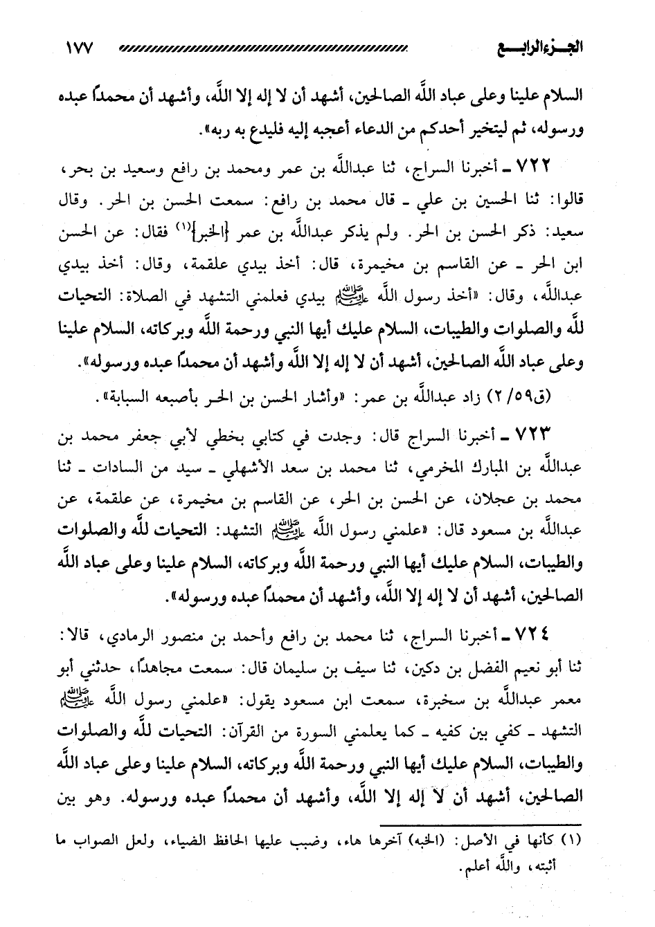 722- أَخْبَرَنَا السَّرَّاجُ، ثنا عَبْدُ اللَّهِ بْنُ عُمَرَ ومحمد بن رافع وسعيد بن بحر، قَالُوا: ثنا الْحُسَيْنُ بْنُ عَلِيٍّ -قَالَ مُحَمَّدُ بْنُ رَافِعٍ: سَمِعْتُ الْحَسَنَ بْنَ الْحُرِّ. وَقَالَ سَعِيدٌ: ذَكَرَ الْحَسَنَ بْنَ الْحُرِّ. وَلَمْ يَذْكُرْ عبد الله بن عمر [الخبر] فقال: عن الحسن ابن الْحُرِّ- عَنِ الْقَاسِمِ بْنِ مُخَيْمِرَةَ، قَالَ: أَخَذَ بِيَدِي عَلْقَمَةُ وَقَالَ: أَخَذَ بِيَدِي عَبْدُ اللَّهِ، وَقَالَ: ((أَخَذَ رَسُولُ اللَّهِ صَلَّى اللَّهُ عَلَيهِ وَسَلَّمَ بِيَدِي فَعَلَّمَنِي التَّشَهُّدَ فِي الصَّلاةِ: التَّحِيَّاتُ لله والصلوات والطيبات، السلام عليك أيها النبي وَرَحْمَةُ اللَّهِ وَبَرَكَاتُهُ، السَّلامُ عَلَيْنَا وَعَلَى عِبَادِ اللَّهِ الصَّالِحِينَ، أَشْهَدُ أَنْ لا إِلَهَ إِلا اللَّهُ وَأَشْهَدُ أَنَّ مُحَمَّدًا عَبْدُهُ وَرَسُولُهُ)) .