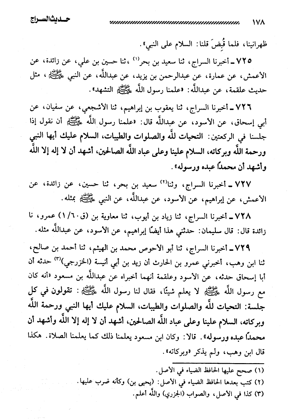 726- أخبرنا السراج، ثنا يعقوب بن إبراهيم، ثنا الأَشْجَعِيُّ، عَنْ سُفْيَانَ، عَنْ أَبِي إِسْحَاقَ، عَنِ الأَسْوَدِ، عَنْ عَبْدِ اللَّهِ قَالَ: ((عَلَّمَنَا رَسُولُ اللَّهِ صَلَّى اللَّهُ عَلَيهِ وَسَلَّمَ أَنْ نَقُولَ إِذَا جَلَسْنَا فِي الرَّكْعَتَيْنِ: التَّحِيَّاتُ للَّهِ وَالصَّلَوَاتُ وَالطَّيِّبَاتُ، السَّلامُ عَلَيْكَ أَيُّهَا النَّبِيُّ وَرَحْمَةُ اللَّهِ وَبَرَكَاتُهُ، السَّلامُ عَلَيْنَا وَعَلَى عِبَادِ اللَّهِ الصَّالِحِينَ، أَشْهَدُ أَنْ لا إِلَهَ إِلا اللَّهُ وَأَشْهَدُ أَنَّ مُحَمَّدًا عَبْدُهُ وَرَسُولُهُ)) .