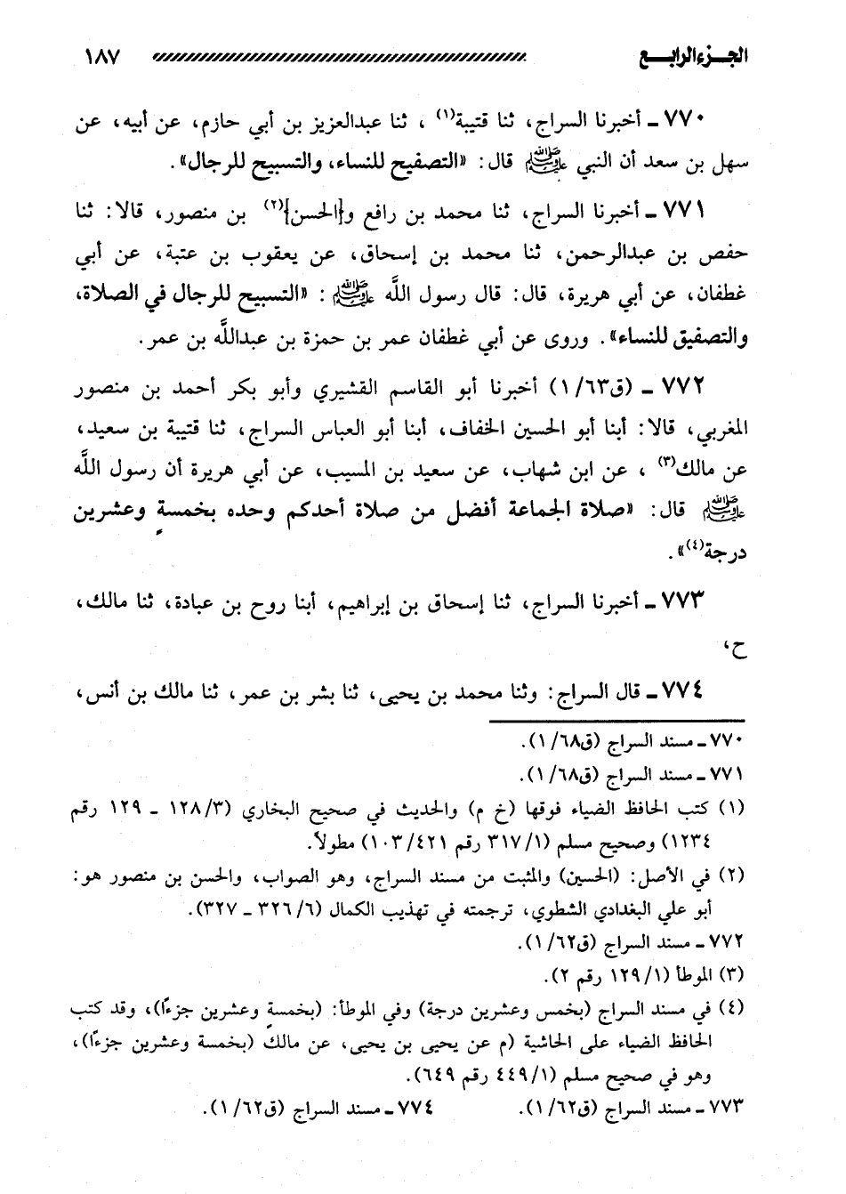 774- قَالَ السَّرَّاجُ: وثنا مُحَمَّدُ بْنُ يَحْيَى، ثنا بِشْرُ بن عمر، ثنا مالك بن أنس، -[188]- عن ابْنِ شِهَابٍ، عَنْ سَعِيدِ بْنِ الْمُسَيِّبِ، عَنْ أَبِي هُرَيْرَةَ أَنَّ رَسُولَ اللَّهِ صَلَّى اللَّهُ عليه وسلم قال: ((صلاة الجماعة أفضل من صَلاةِ أَحَدِكُمْ وَحْدَهُ بِخَمْسَةٍ وَعِشْرِينَ جُزْءًا)) .