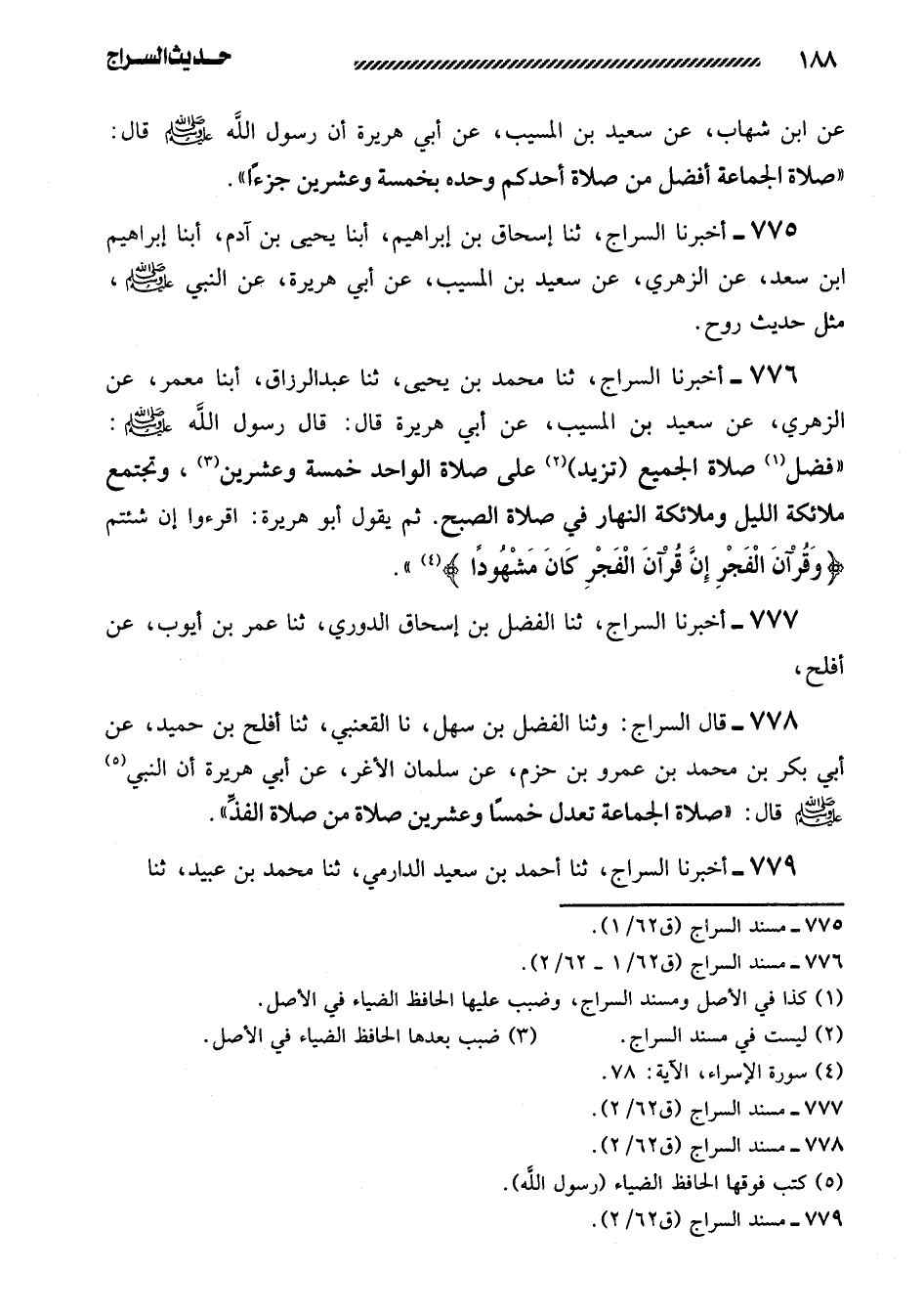 776- أخبرنا السراج، ثنا محمد بن يحيى، ثنا عبد الرزاق، أبنا معمر، عن الزهري، عن سعيد بن المسيب، عن أبي هريرة قال: قال رسول الله صَلَّى اللَّهُ عَلَيهِ وَسَلَّمَ: ((فَضْلُ صَلاةِ الْجَمِيعِ (تزيد) عَلَى صَلاةِ الْوَاحِدِ خَمْسَةً وَعِشْرِينَ، وَتَجْتَمِعُ مَلائِكَةُ اللَّيْلِ وَمَلائِكَةُ النَّهَارِ فِي صَلاةِ الصُّبْحِ. ثُمَّ يقول أبو هريرة: اقرءوا إن شئتم {وقرآن الفجر إن قرآن الفجر كان مشهوداً} .