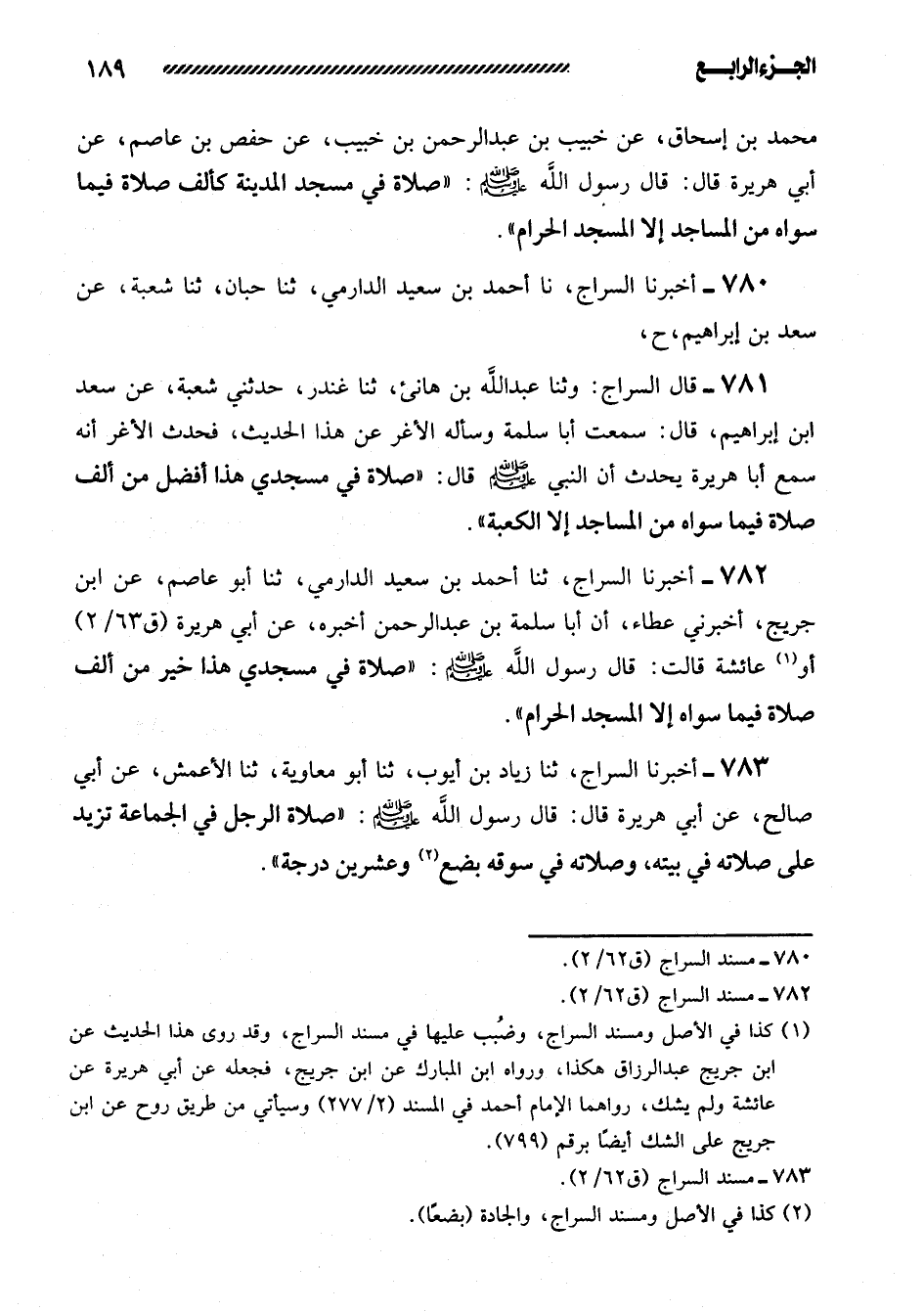 782- أَخْبَرَنَا السَّرَّاجُ، ثنا أَحْمَدُ بْنُ سَعِيدٍ الدَّارِمِيُّ، ثنا أَبُو عَاصِمٍ، عَنِ ابْنِ جُرَيْجٍ، أَخْبَرَنِي عَطَاءٌ، أَنَّ أَبَا سَلَمَةَ بْنَ عَبْدِ الرَّحْمَنِ أخبره، عن أبي هريرة أو عَائِشَةَ قَالَتْ: قَالَ رَسُولُ اللَّهِ صَلَّى اللَّهُ عَلَيهِ وَسَلَّمَ: ((صَلاةٌ فِي مَسْجِدِي هَذَا خَيْرٌ مِنْ أَلْفِ صَلاةٍ فِيمَا سِوَاهُ إِلا الْمَسْجِدَ الحرام)) .